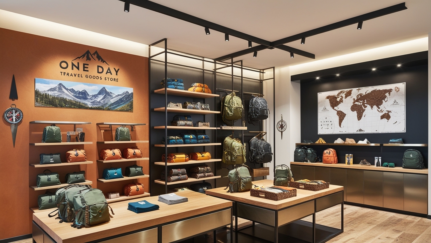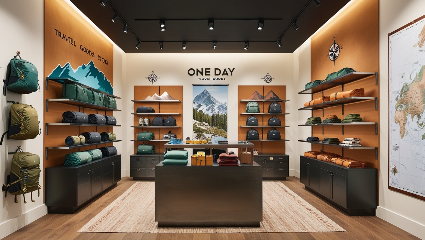 Для создания пространства я сначала попросила Chat GPT создать описание для генерации нужного изображения. Prompt: Create a modern and inviting interior for a travel goods store called ONE DAY. The space should combine functionality with an adventurous spirit, showcasing sleek displays and natural elements that evoke a desire to explore. Use warm, earthy tones combined with metallic accents such as brushed steel and matte black to create a sophisticated yet approachable atmosphere. Organize shelves and racks that display items such as backpacks, hiking and outdoor gear. Add wall graphics of mountain scenery, maps and compasses for inspiration. Incorporate soft diffused lighting with brighter task lighting to highlight key merchandise/