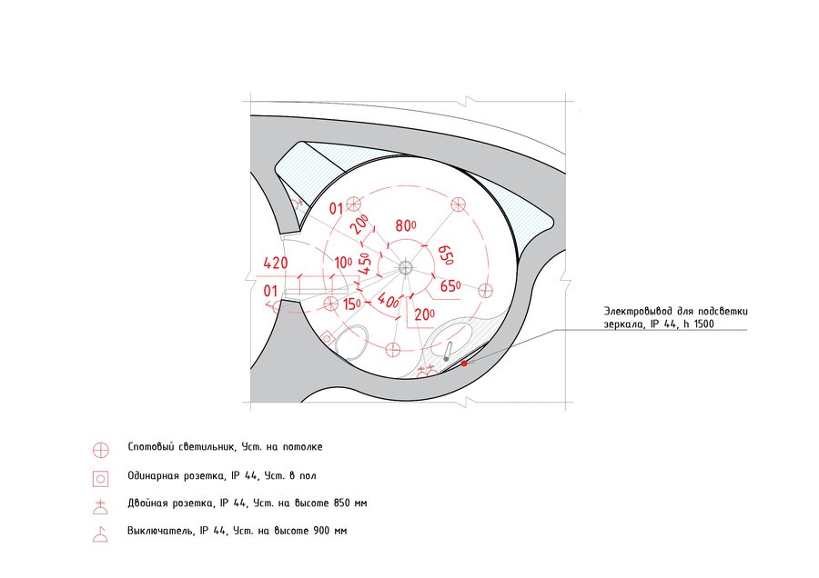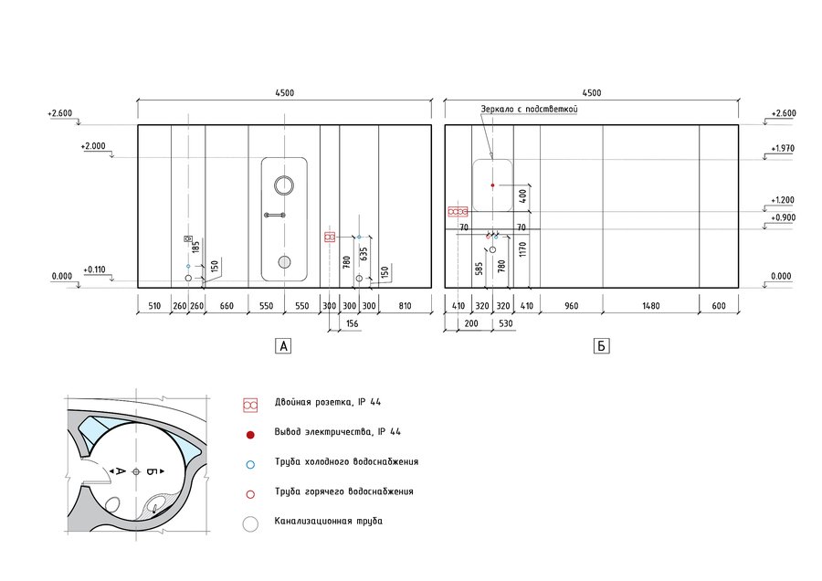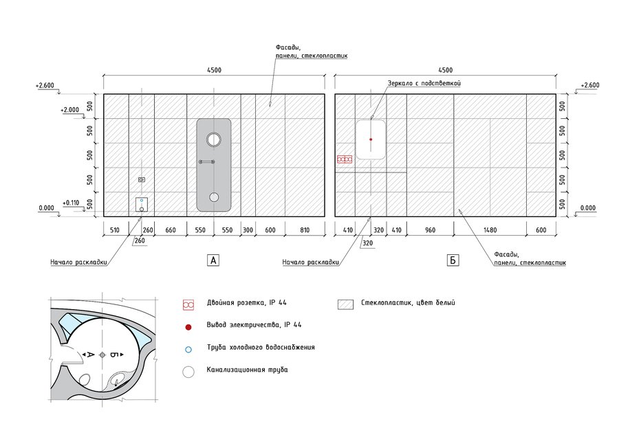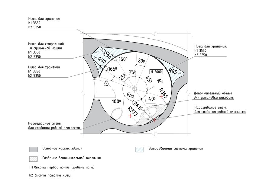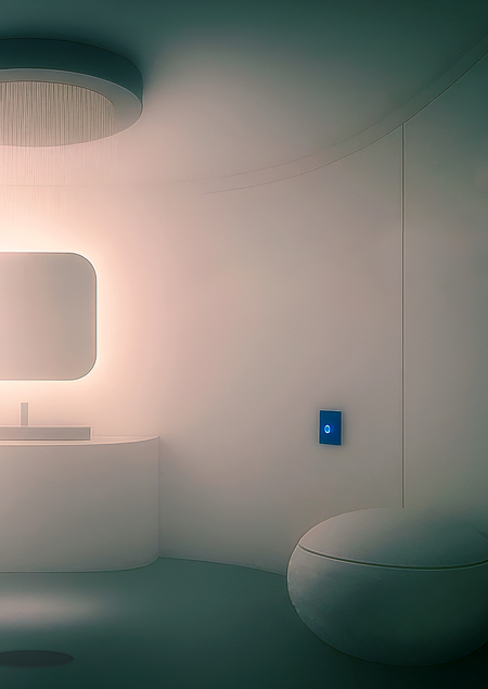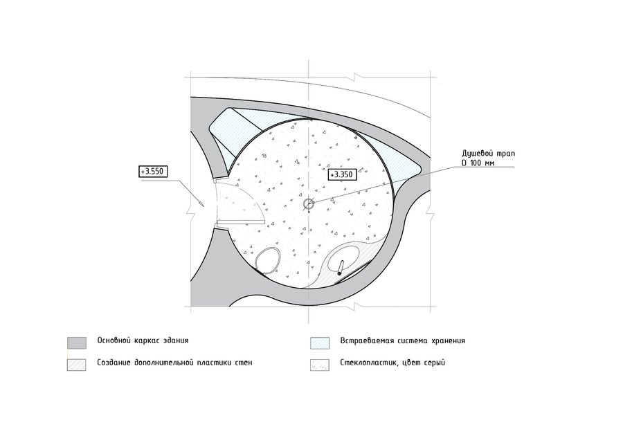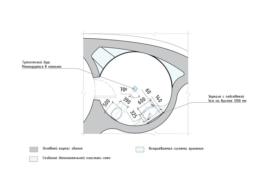 Проект санузла подчинен общей футуристичной специфике здания и учитывает подобную стилизацию при разработке планировочных решений и выборе материалов внутренней отделки.