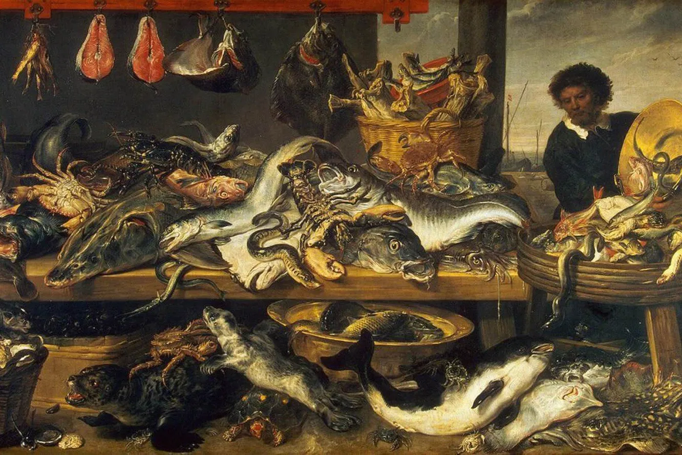 «Натюрморт с рыбой», фреска из Помпеи, Франс Снейдерс, «Рыбная лавка» (фрагмент) (1618)