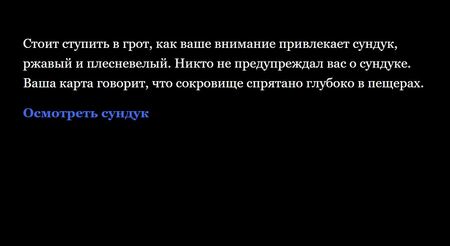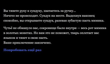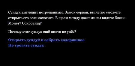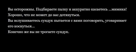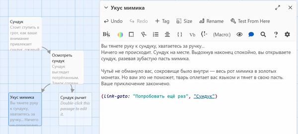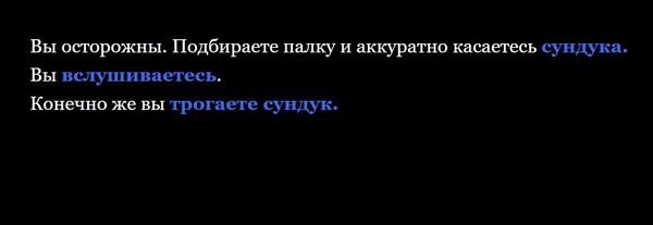 Код из примера выше: Вы осторожны. Подбираете палку и аккуратно касаетесь сундука. (click-replace: "сундука.")[...мимика! Хорошо, что не может до вас дотянуться.] Вы вслушиваетесь. (click-append: "вслушиваетесь")[ сундук пытается с вами поговорить, уговаривает его коснуться..] Конечно же вы трогаете сундук. (click-prepend: "трогаете сундук.")[ не ]