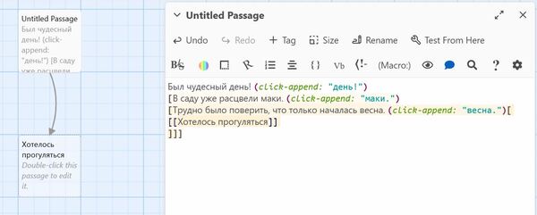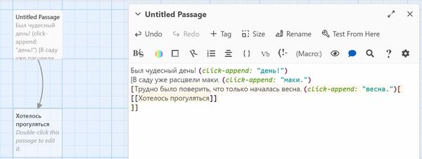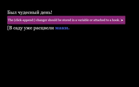 NB #2 Click-и можно наслаивать и комбинировать с ссылками между параграфами. Был чудесный день! (click-append: "день!") [В саду уже расцвели маки. (click-append: "маки.") [Трудно было поверить, что только началась весна. (click-append: "весна.")[ [[Хотелось прогуляться]] ]]]
