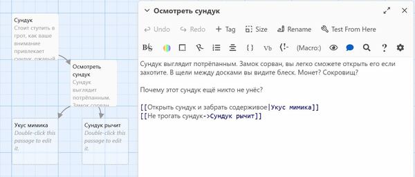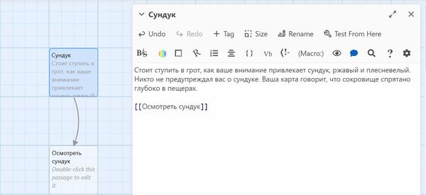 N.B.: В процессе изучения материала пробуйте копировать код в Twine и смотреть, как он работает интерактивно, а также пробовать писать свой код!