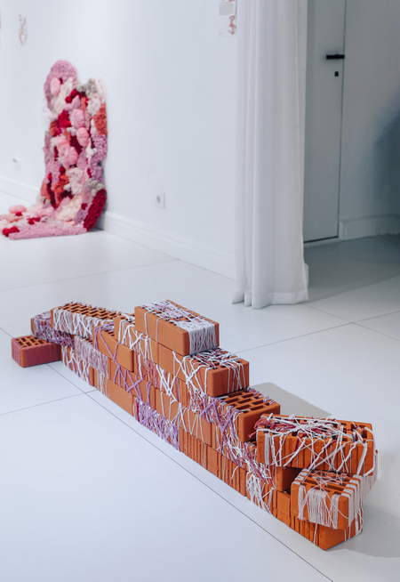Кирпичная стена являет собой реальную преграду на пути, которая «нивелируется» и украшается нитями, которые ее маскируют. Акт украшательства производится ненавязчиво, однако мягкий материал покрывает кирпичи, что говорит о его четком намерении превратить устойчивость в хрупкость.