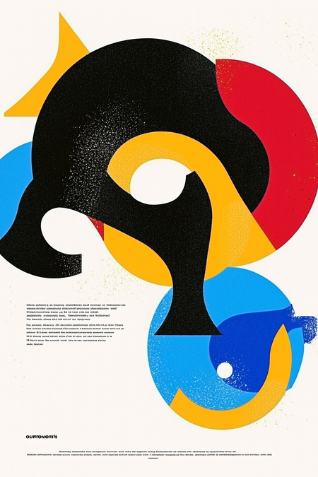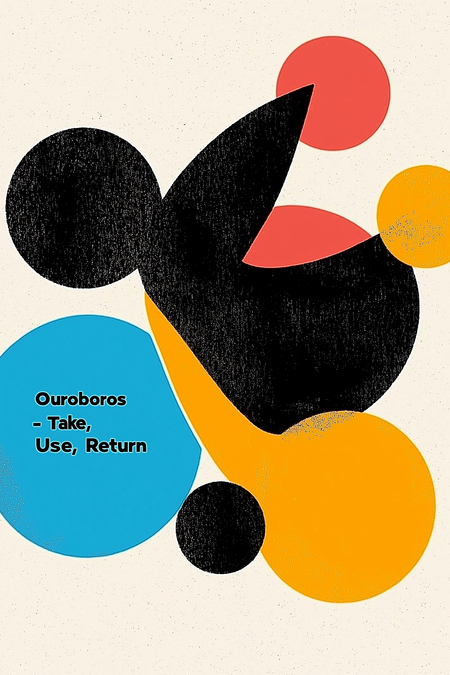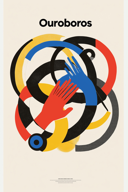 Плакаты: 1. A typographic lettering poster with dada typography different LETTERS written on it two hands for ouroboros company with minimalist graphic featuring interlocking circular shapes in black, red, blue and yellow. «Ouroboros» written in the top center of the poster 2. A cozy, modern label design for a vase, featuring interlocking circular shapes in black, red, blue, and yellow. The layout has a slightly playful, chaotic arrangement of circles and elements, with text «Ouroboros — Take, Use, Return» in a warm, casual font. add a friendly, inviting feel. Soft, warm (+3 изображения)