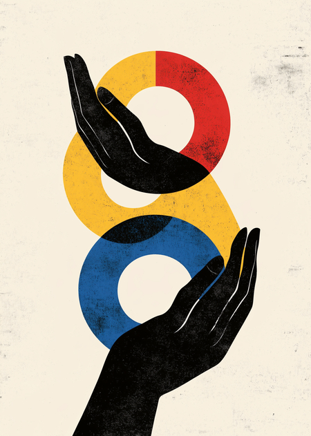Midjourney: A minimalist graphic featuring four interlocking circular shapes in black, red, and yellow against a white background. The circles overlap in a symmetrical arrangement, creating an abstract design that evokes unity and diversity. (+3 изображения)