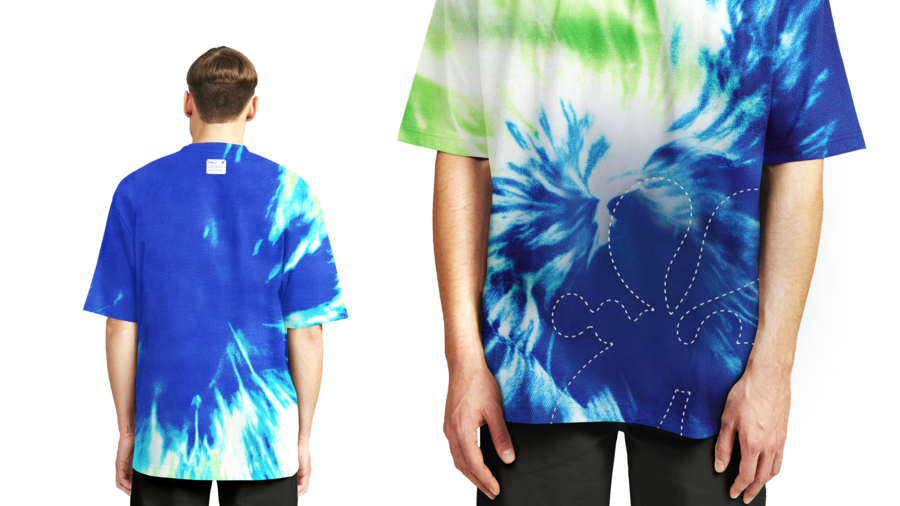 Merch in tai-day technique: the drawing refers to the texture of wool in the physical form of the dog.
