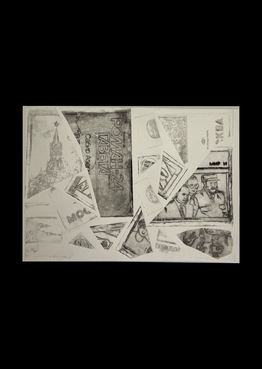Недавно моя семья приобрела загородный дом, принадлежавший 93-летнему Владимиру Ивановичу. Внутри дом похож на музей советской истории, наполненный старыми коллекциями журналов, вырезками из газет, открытками, значками, картами Москвы и другими атрибутами прошлой эпохи. Я забрала понравившиеся мне артефакты и решила создать с ними работу. Первые два оттиска — сами найдененные предметы, символизирующие живую историю, сохраненную в материальных объектах. Для создания третьего оттиска я варварски разломала оргстекло на небольшие осколки и собрала мозаику.