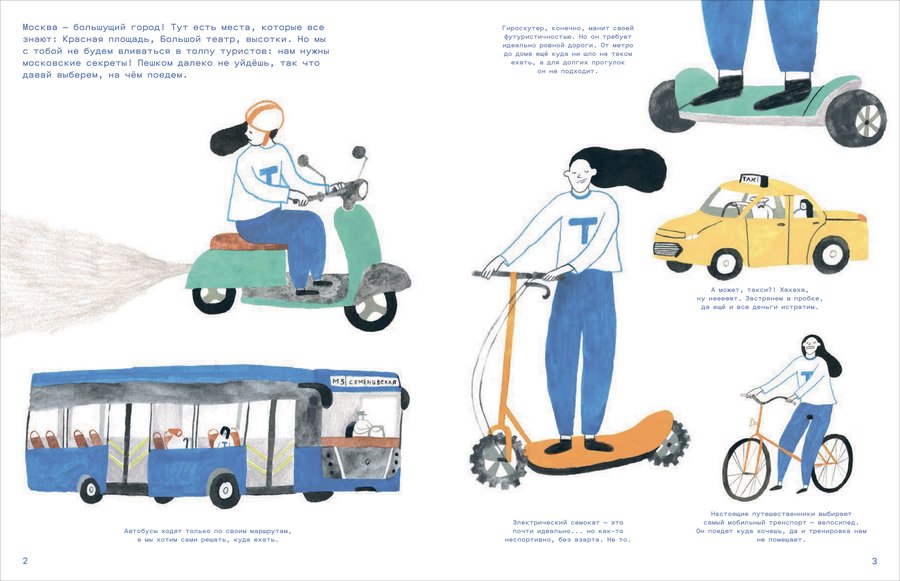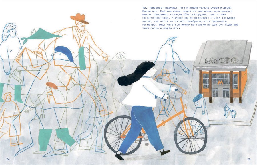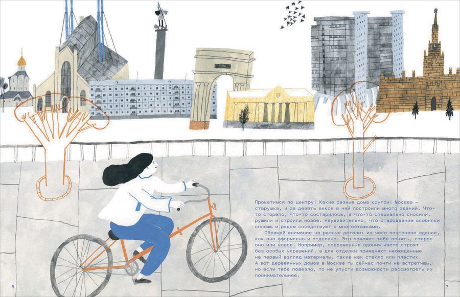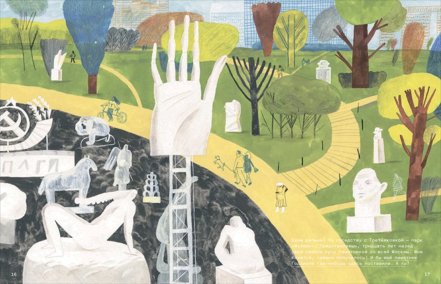Разворот книги «Привет, Москва!», ил. Т. Борисова, фото: Борисова Т. Привет, Москва! / Т. Борисова. М: Ад Маргинем Пресс: ABCdesign, 2021 (А+А). — 40 с.: цв. ил. — ISBN 978-5-91103-600-3