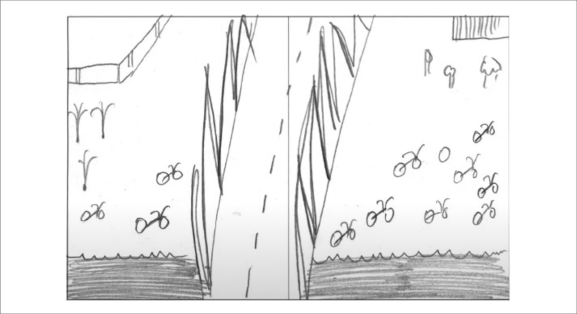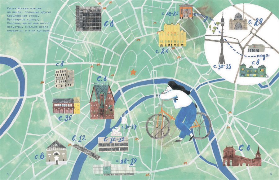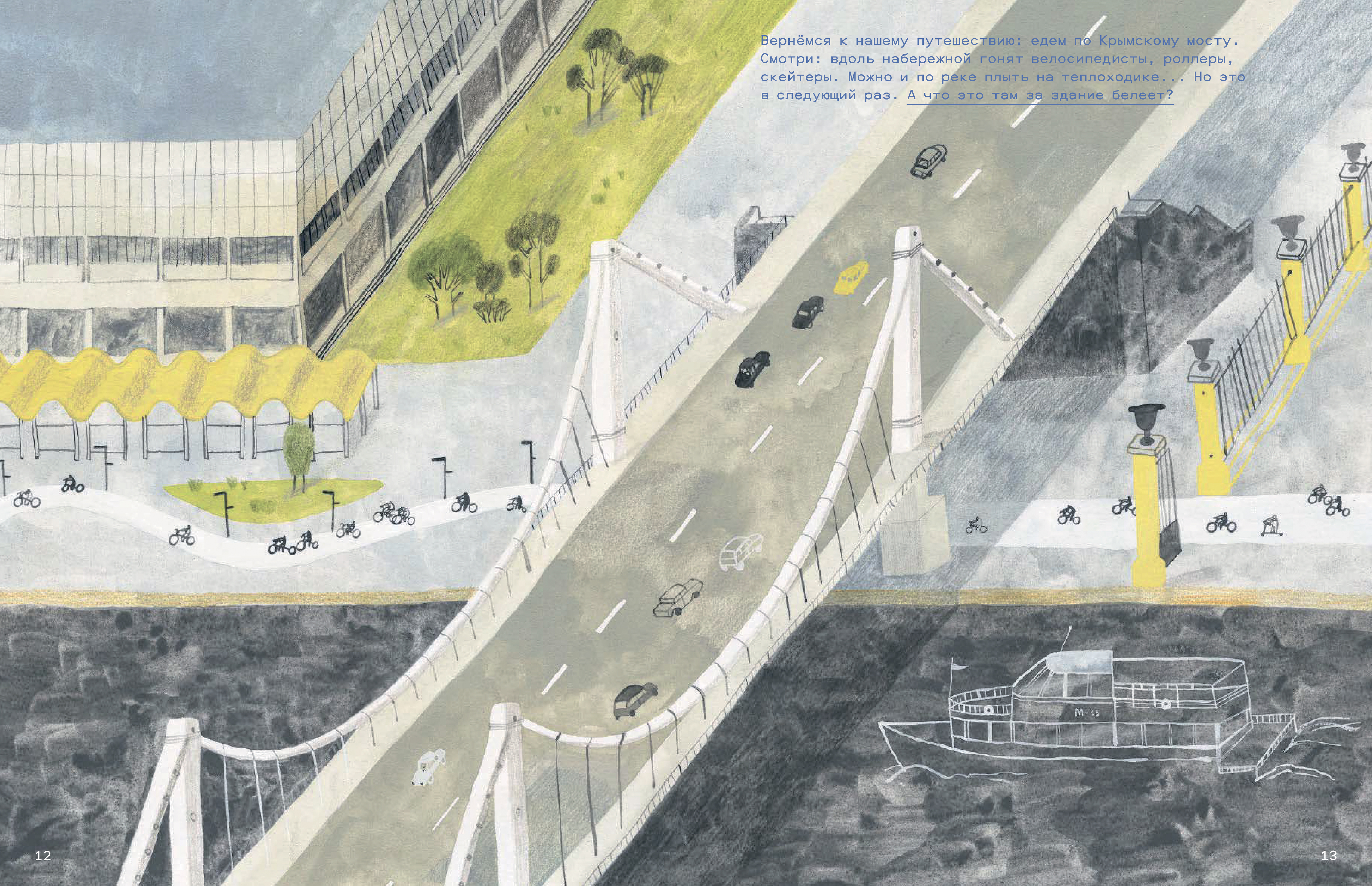 Большое количество мостов и велосипедистов города, постоянно куда-то движущихся (стр. 12-13), как составная часть образа. По словам Тани, это один из ее любимых разворотов, поддерживающий ритм и города, и всей книги [15].