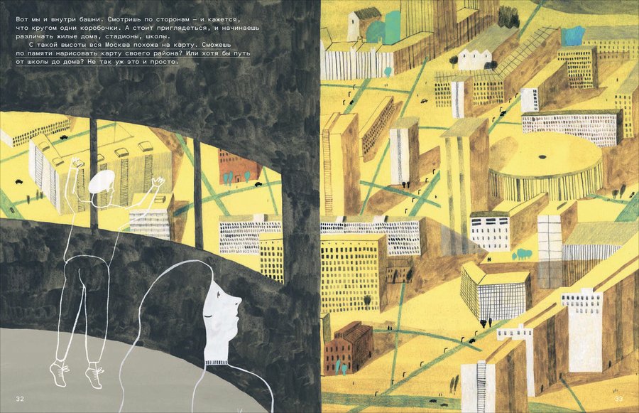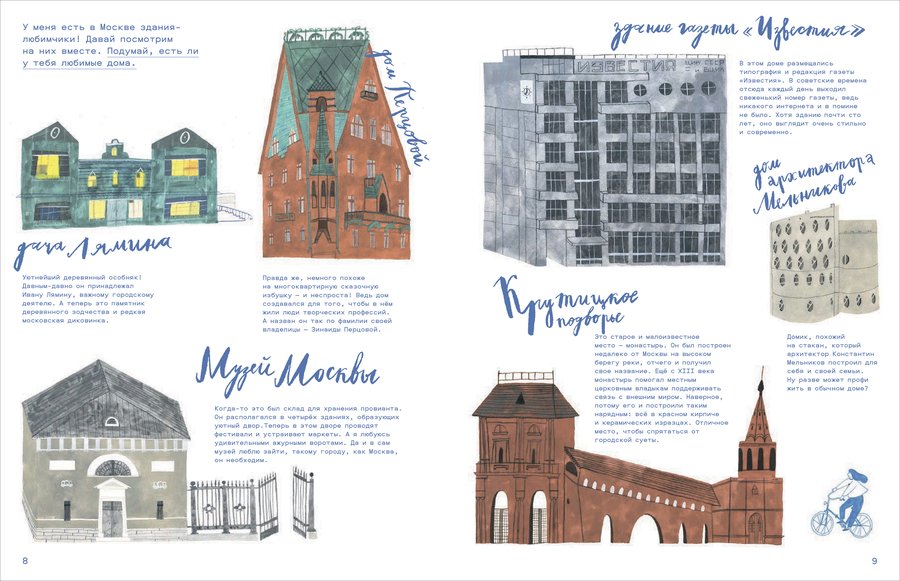 Основной упор в книге сделан на изображении архитектуры, поскольку город без архитектуры не возможен. Разворот с изображениями зданий (стр.8-9) включает в себя любимые здания Тани, куда попал даже деревянный особняк, которых почти не осталось в городе, но кусочек «деревянной Москвы» теперь хранится на развороте. Разворот (стр. 6-7) передает общее ощущение от архитектуры города: полное смешение различных времен и стилей, своего рода «винегрет из зданий», который кажется забавным и честным, включающим в себя и центр, и спальные районы одновременно. Невозможная картина в реальности оживает на страницах книги, давая то самое представление о городе коренного жителя.
