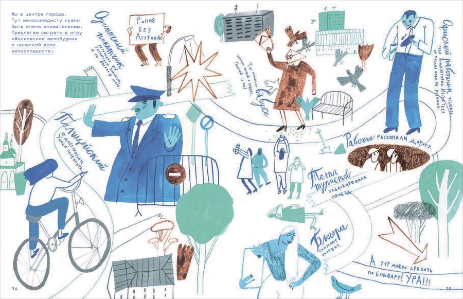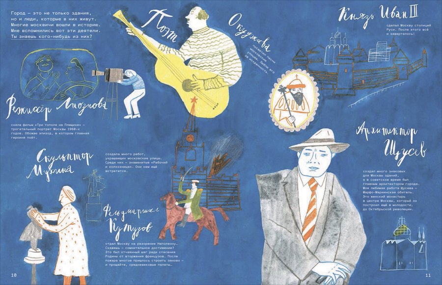 Люди — еще одна составная часть города. На разворотах постоянно встречаются и конкретные лица, и проходные фигуры. В большинстве своем это контурные полупрозрачные фигуры, которые сливаются с окружением, создавая единый, почти не различимый в деталях, образ города. Города всегда спешащего, всегда шумного и быстрого. На одном из разворотов (стр.10-12), где изображены конкретные люди, Таня показала тех, кто каким-либо образом повлиял на становление города. Это люди разных эпох и разных профессий. На одном развороте соседствуют и Великий Князь, и советский режиссер, скульптор и полководец, архитектор и поэт: люди разных эпох, но определенно значимых для города и для его жителей. Разворот с типажами горожан и гостей города (стр. 34-35) показывает нелегкий путь по городу среди людей, которые могут мешать: блогеры, рабочие, бабушки, полиция. Сложность движения по Москве является всеобще известным фактом, но Тане удалось показать с помощью одной иллюстрации трудности так, что над ними хочется посмеяться и понять их, без какого либо негатива.