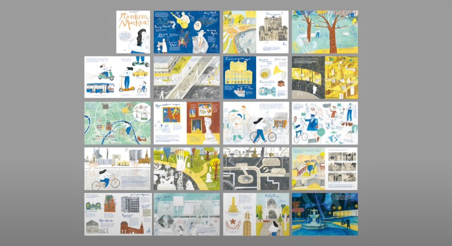 Развороты книги «Привет, Москва!», ил. Т. Борисова, фото: Борисова Т. Привет, Москва! / Т. Борисова. М: Ад Маргинем Пресс: ABCdesign, 2021 (А+А). — 40 с.: цв. ил. — ISBN 978-5-91103-600-3