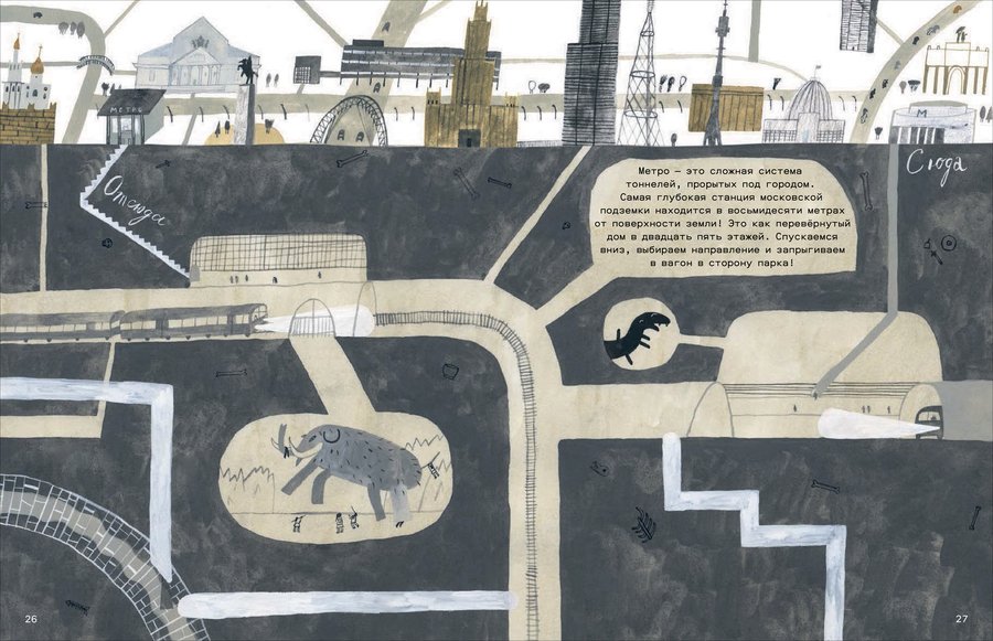 Метро — огромная и практически невидимая часть города. Во время пешей прогулки в книге персонаж видит только здание станции, а что находится под землей? Тут уже можно фантазировать: мамонты, вымышленные существа, рельсы, идущие вглубь… Таня создает целый мир, мир фантазийный, снова совмещающий нереальное в наше время, мир, который мог бы себе представить ребенок, но который никто не запретит представить и взрослому. Долгий увлекательный путь под землей, трудный и опасный, но на который надо решиться.