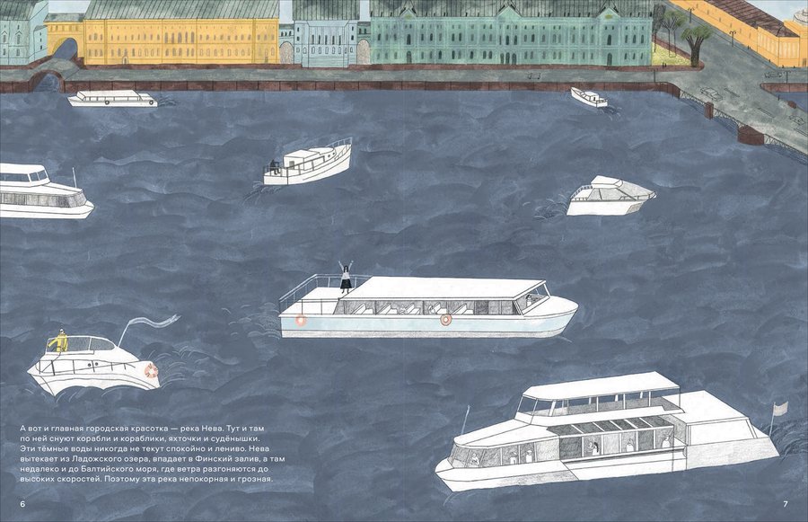Тот факт, что Петербург — портовый город, не делает его менее привлекательным. Это создает особый шарм города. Смотря на набережную с верфями буквально слышатся чайки и ощущается ветер. Путешествие по городу начиналась с изображения воды (стр.6-7) и заканчивается им же (стр. 38-39), несмотря на разницу мест. Композиция книги получилась кольцевой, как и само путешествие, которое непременно хочется повторить еще много раз по кругу.
