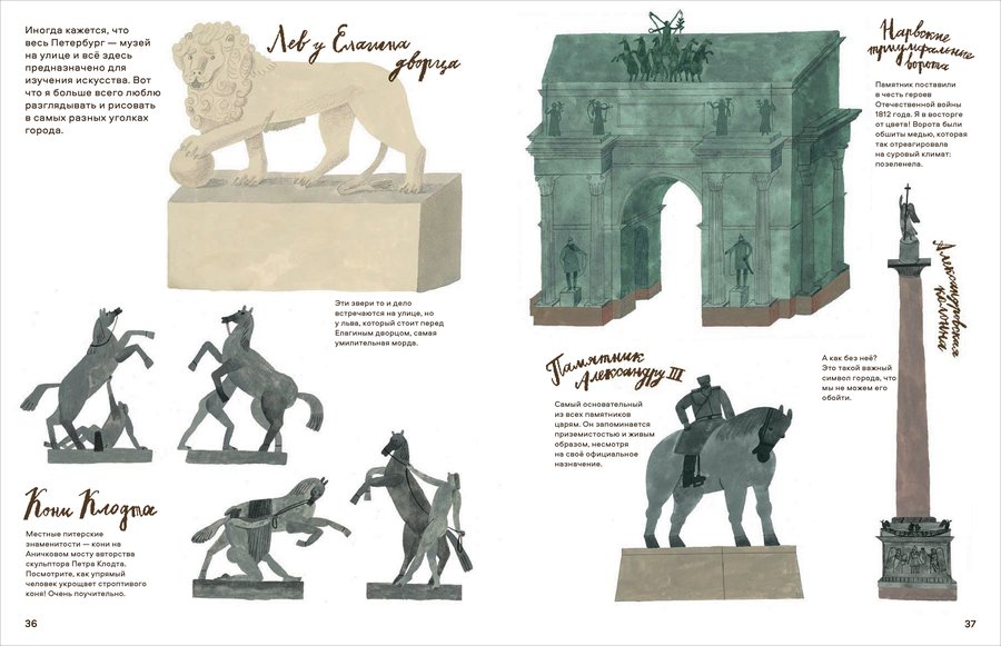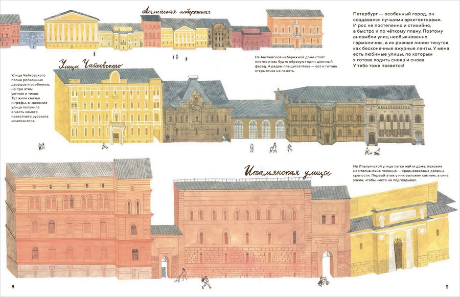 Развороты книги «Привет, Петербург!», ил. Т. Борисова, фото: Борисова Т. Привет, Петербург! / Т. Борисова. М: Ад Маргинем Пресс: ABCdesign, 2023 (А+А). — 40 с.: цв. ил. — ISBN 978-5-91103-657-7