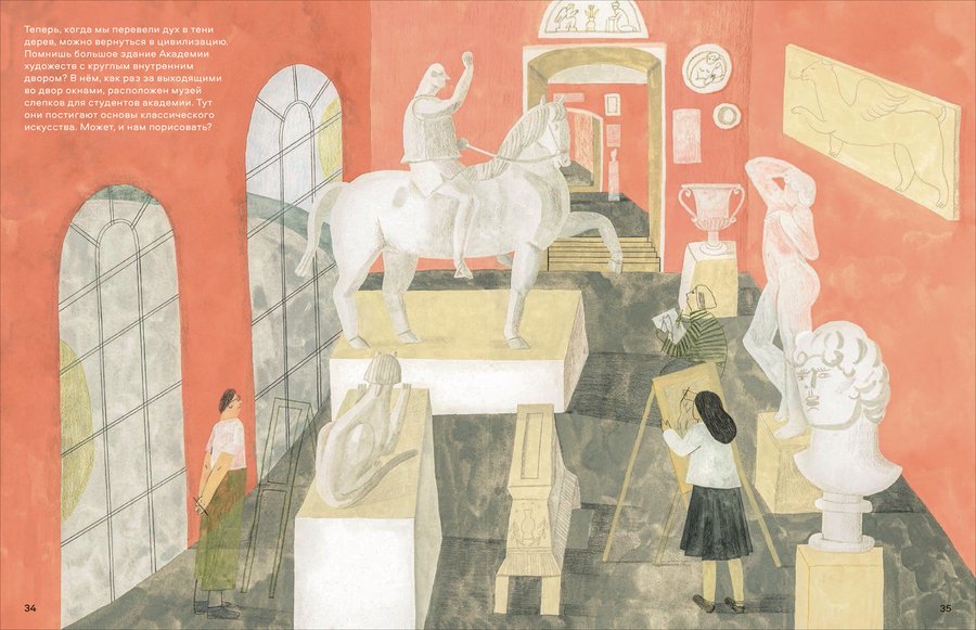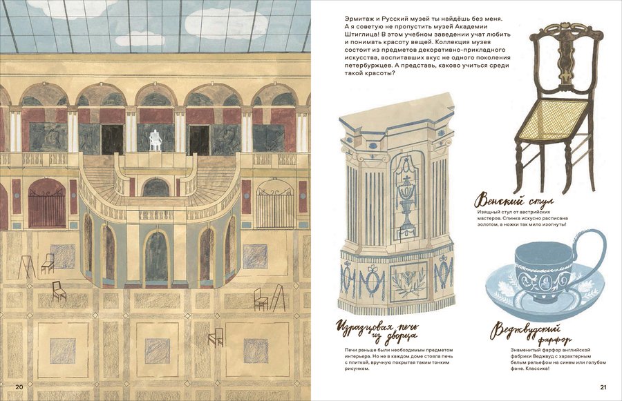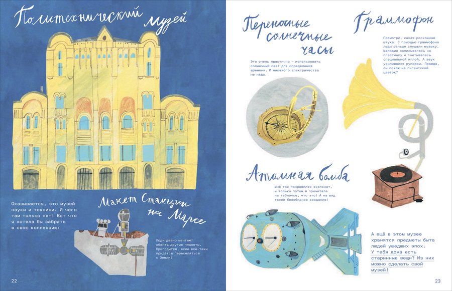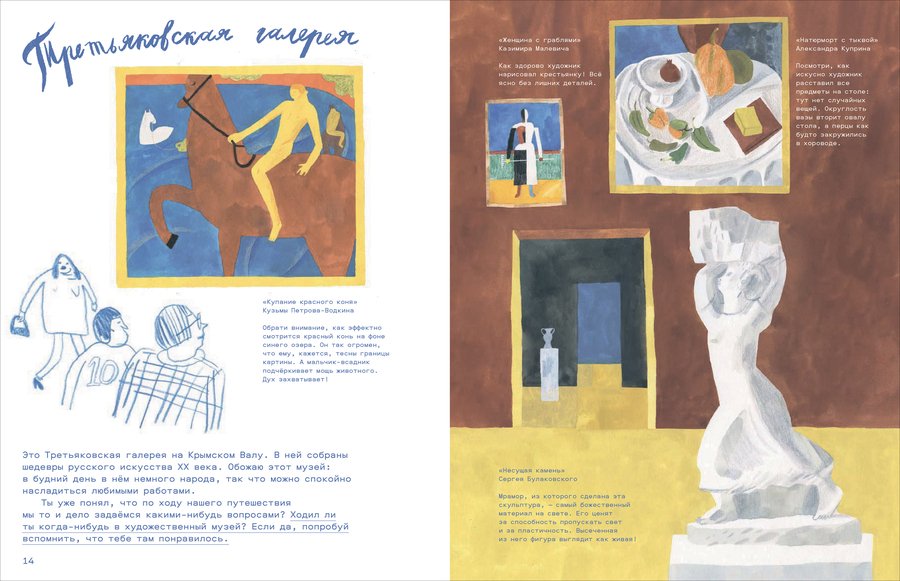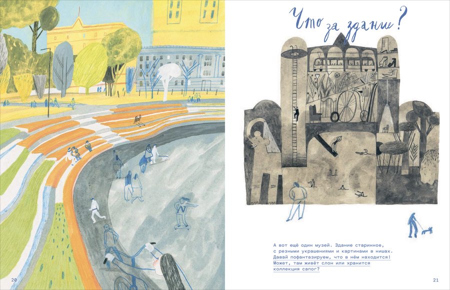 Музеи — важная институция города, которая по-своему открывается в работах Тани. Ходить по музеям — традиция из детства, когда она посещала музеи с бабушкой [15], что и хотелось передать в работах. На разворотах книги читатель ощущает себя как маленький ребенок перед огромными пугающими зданиями, но очень интересными при этом всем. Музеи разные: современное искусство, классическое, наука, все это необычайно интересно и непросто для понимания. Но постоянный диалог автора с читателем нивелирует страх перед непонятным, поддерживает, заинтересовывает и увлекает.