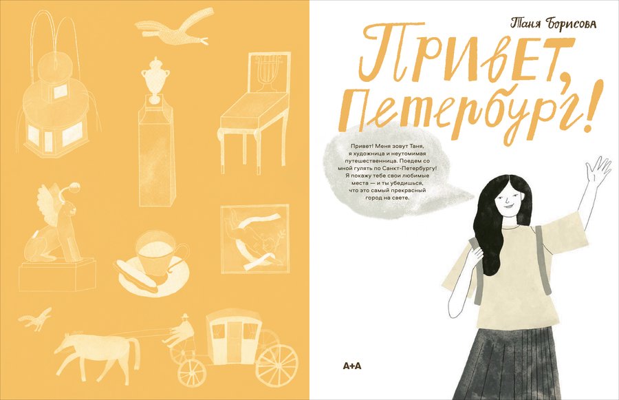 Обложка и разворот книги «Привет, Петербург!», ил. Т. Борисова, фото: Борисова Т. Привет, Петербург! / Т. Борисова. М: Ад Маргинем Пресс: ABCdesign, 2023 (А+А). — 40 с.