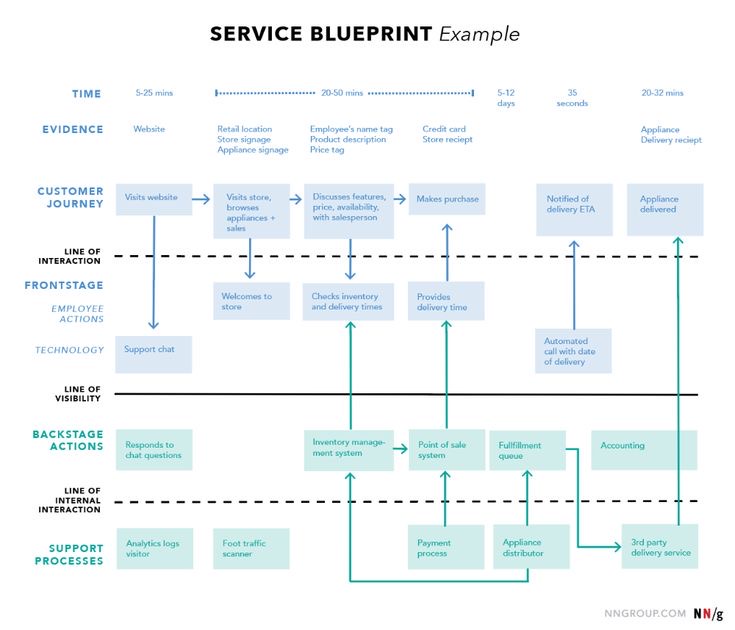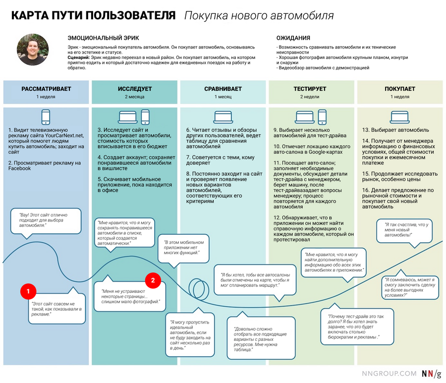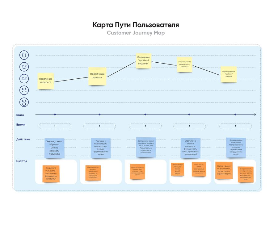 // Это визуализация будущего контакта человека с Вашим продуктом. Она разделена на этапы, в которых показываются и действия людей, и впечатления от использования / посещения / etc.