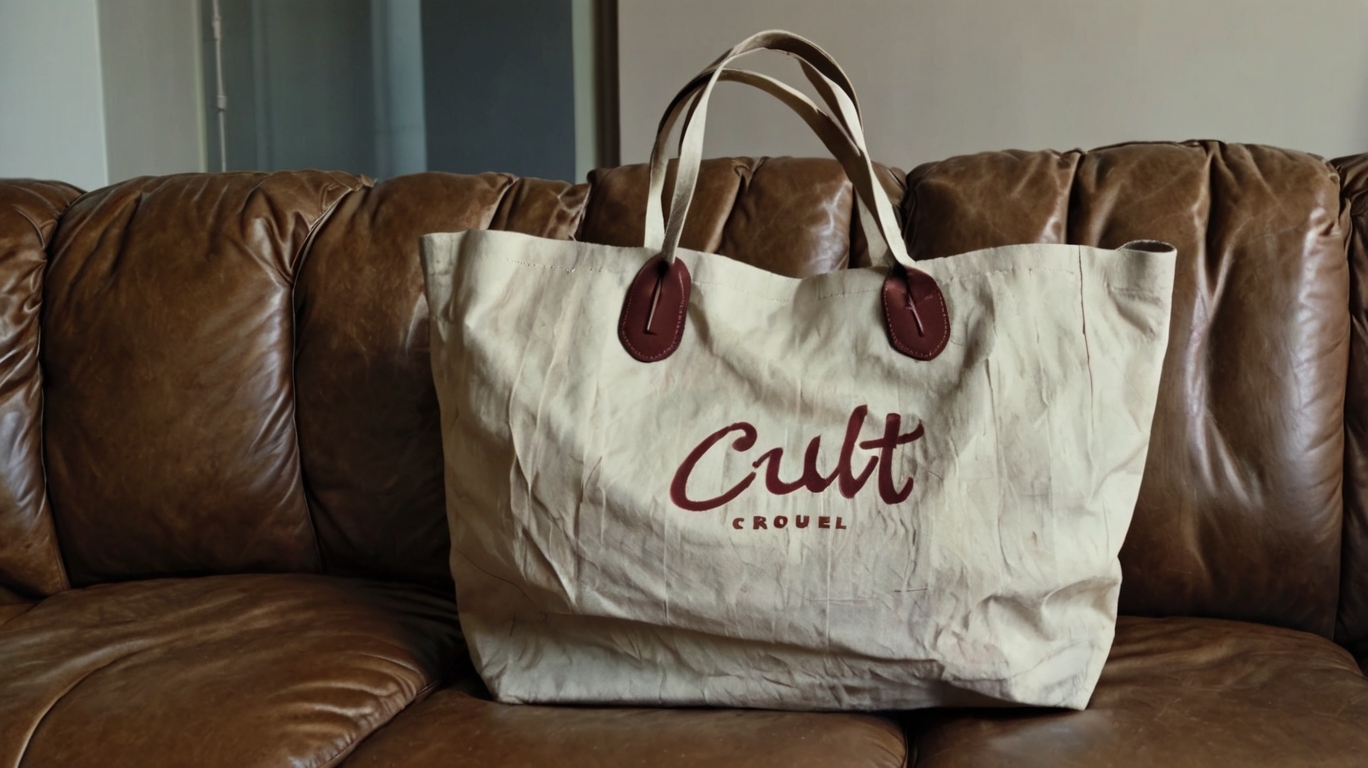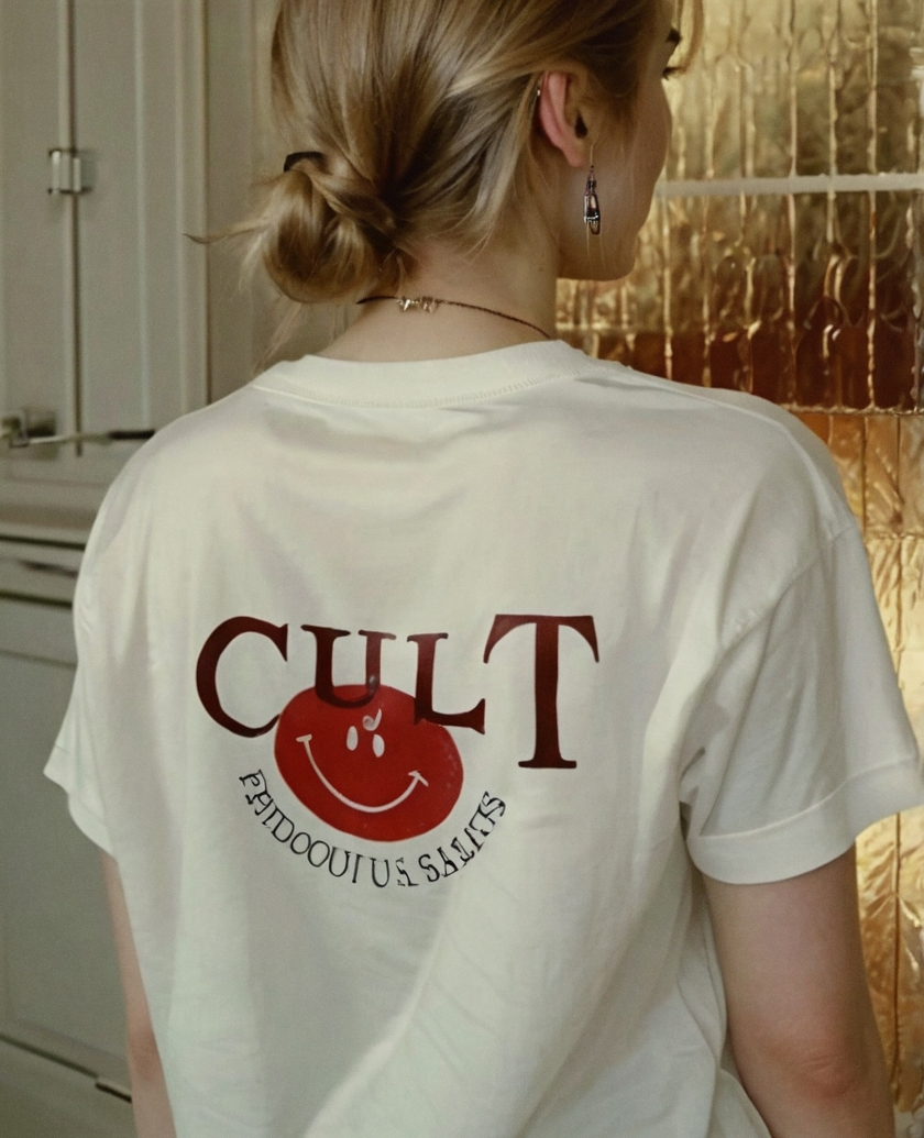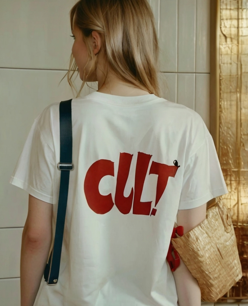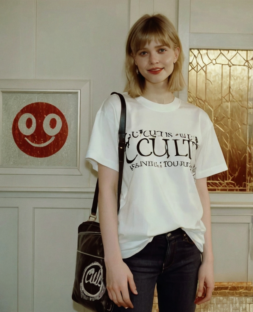 /bag promt: A beige crompled tote bang lees casually on a Brown lighter sofa. The Bag Has a hand-written red log that sais «clut». Blow the log is small text. «Film grain"/entrance promt: the focus to the ground, in the meddle of which is a White log «clut» written by hand. At the bottle of the log is the number «24/7» which features the opening hours. The entrence is glass, behind it through the glass you can see the interor of the story itself, stone or food. t-shirt promt: the girl is standing with her back to Us, in a high-end T-shirt, on which on the Bag those is a Red log «clut» written by hand. Just below the log is a red smiling smiley without a will only with a red carless outline. film grain