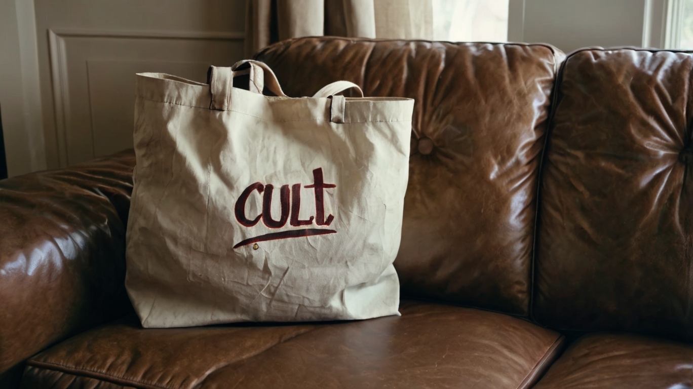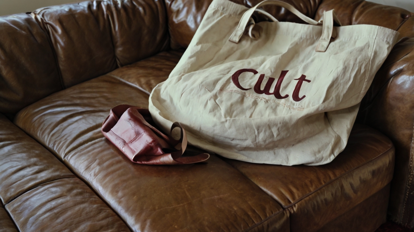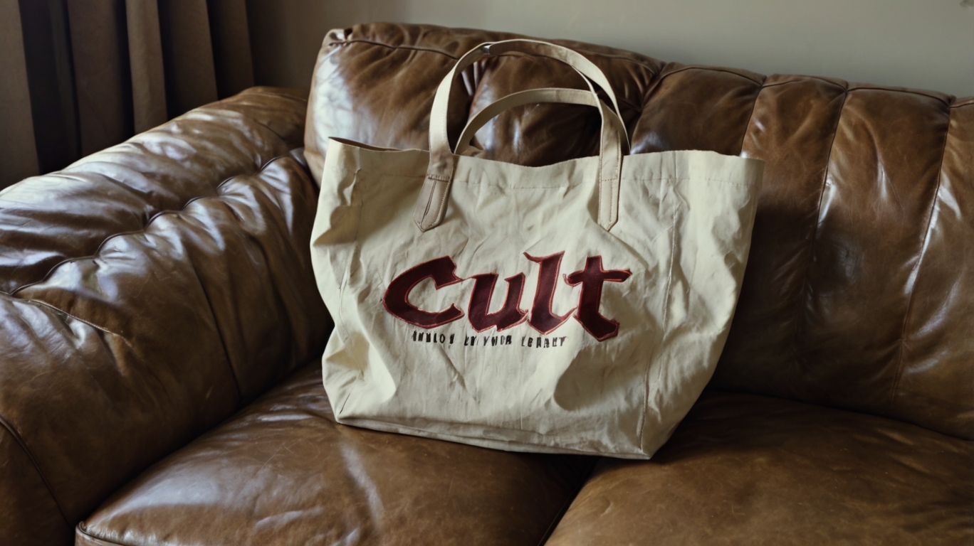 /bag promt: A beige crompled tote bang lees casually on a Brown lighter sofa. The Bag Has a hand-written red log that sais «clut». Blow the log is small text. «Film grain"/entrance promt: the focus to the ground, in the meddle of which is a White log «clut» written by hand. At the bottle of the log is the number «24/7» which features the opening hours. The entrence is glass, behind it through the glass you can see the interor of the story itself, stone or food. t-shirt promt: the girl is standing with her back to Us, in a high-end T-shirt, on which on the Bag those is a Red log «clut» written by hand. Just below the log is a red smiling smiley without a will only with a red carless outline. film grain