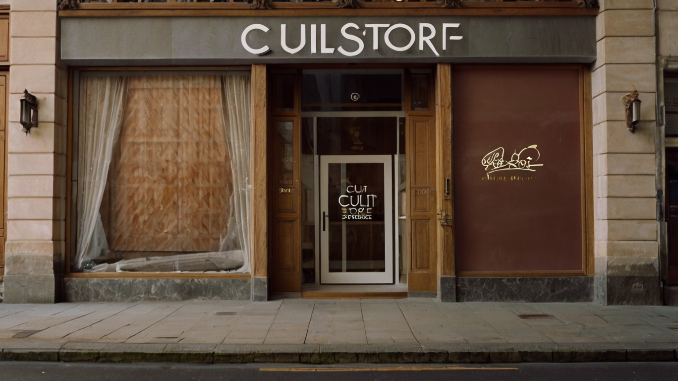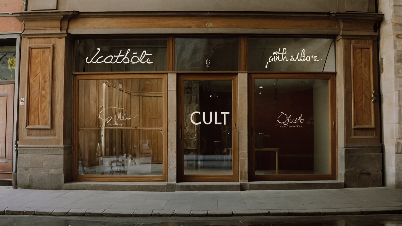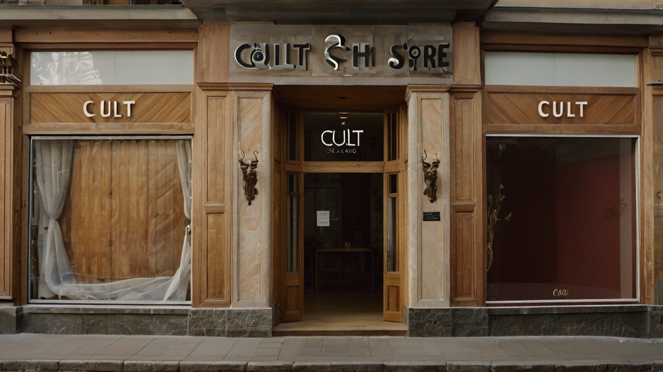 Promt: Design a modern brutalist concrete building for a selective second-hand store in a vast, deserted landscape. The architecture features sharp angles, heavy overhangs, and stacked blocks, with large floor-to-ceiling windows framed by white curtains. A prominent 'CULT' sign is displayed on the building. The environment is minimal and barren, with fog or dust enhancing an eerie, isolated mood. The palette is gray with subtle black and red accents, combining dystopian, avant-garde, and rebellious aesthetics for a cinematic and powerful atmosphere.
