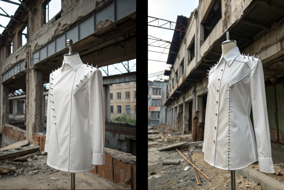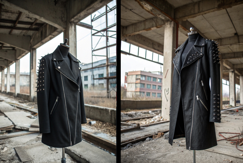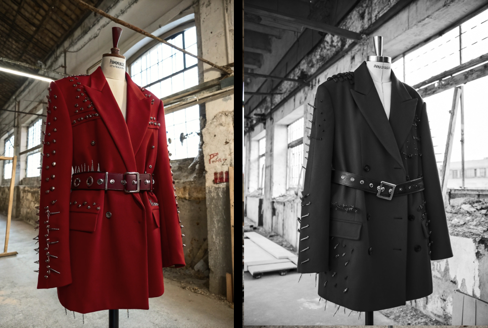 promt: An oversized red blazer in the style of Maison Margiela, featuring raw, torn edges on the sleeves. The blazer is layered with a large, bold belt over it, adding an industrial and rebellious touch. The jacket is adorned with numerous safety pins, giving it a deconstructed, avant-garde feel. The blazer is displayed on a mannequin inside a partially ruined brutalist building, with exposed concrete and industrial elements, enhancing the raw, edgy aesthetic of the garment.