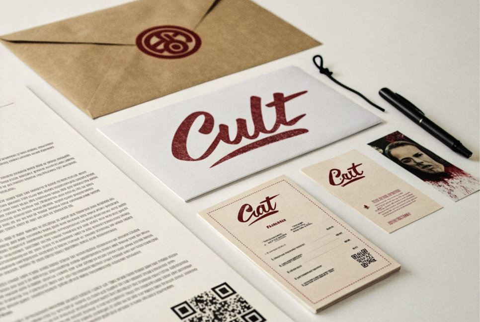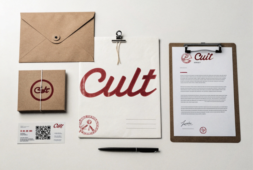 promt: create printed documentation: a contract, an envelope, business cards on a white background for the clothing brand «CULT» in the style of realism. are huge letters of the CULT logo, which in turn is written in red paint. is printed on high-quality paper with the CULT logo, text sentences about our company and clothing, as well as a small QR code at the very bottom of the side.