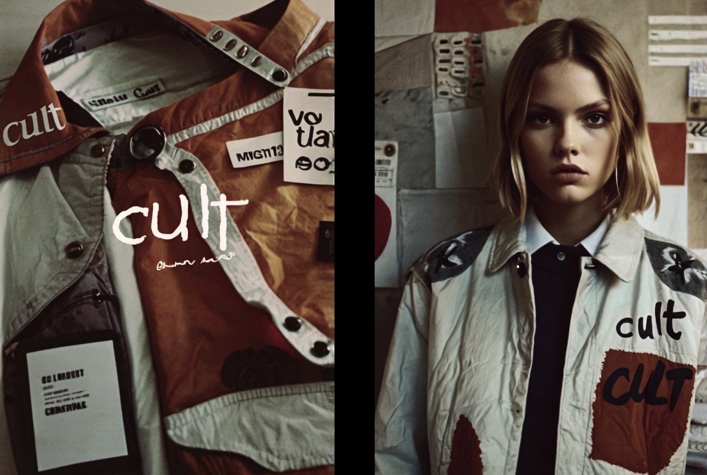 poster: Poster for the clothing brand «CULT» in the style of realism. The poster shows a close-up of a jacket covered with pins and various fabrics. Behind the jacket are huge letters of the CULT logo, which in turn is written in red paint. The poster is printed on high-quality paper with the CULT logo, text sentences about our company and clothing, as well as a small QR code at the very bottom of the side. film grain