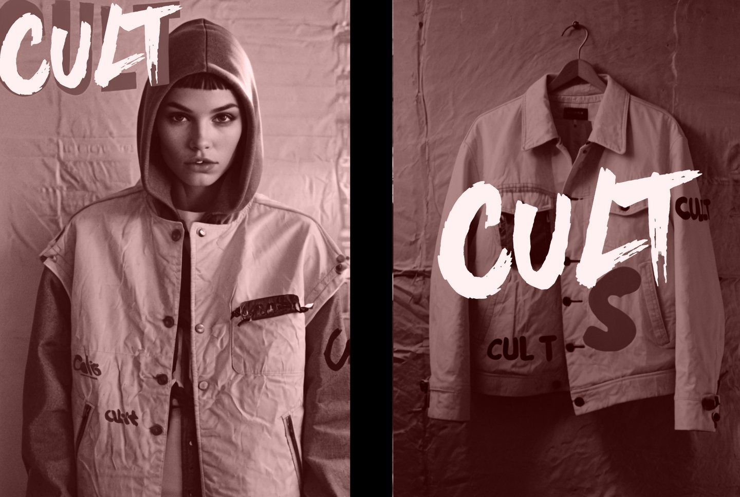 poster promt: Poster for the clothing brand «CULT» in the style of realism. The poster shows a close-up of a jacket covered with pins and various fabrics. Behind the jacket are huge letters of the CULT logo, which in turn is written in red paint. The poster is printed on high-quality paper with the CULT logo, text sentences about our company and clothing, as well as a small QR code at the very bottom of the side. mockup: create a mockup for a horizontal poster on a stone urban background with a foggy atmosphere