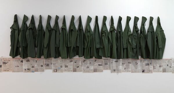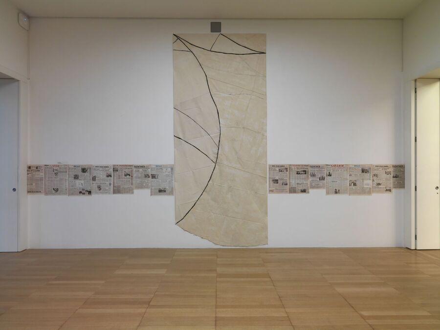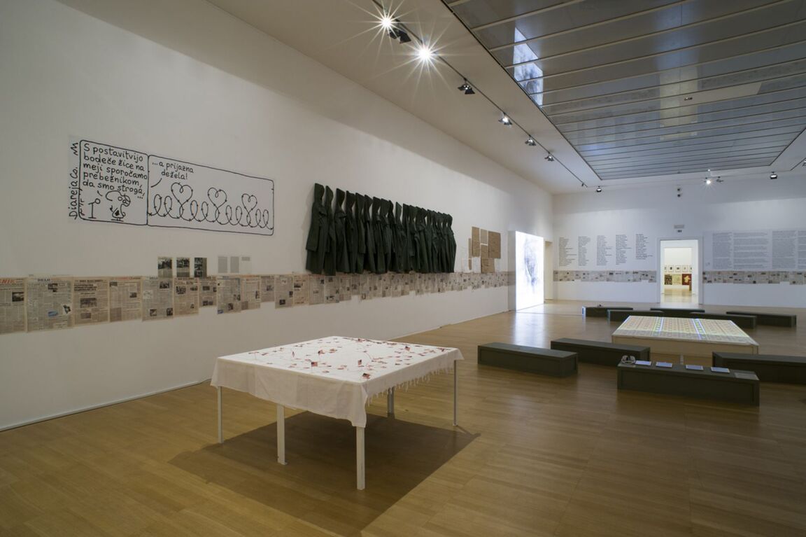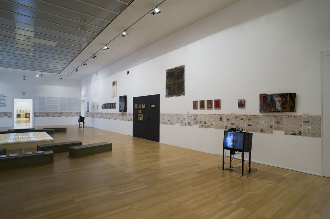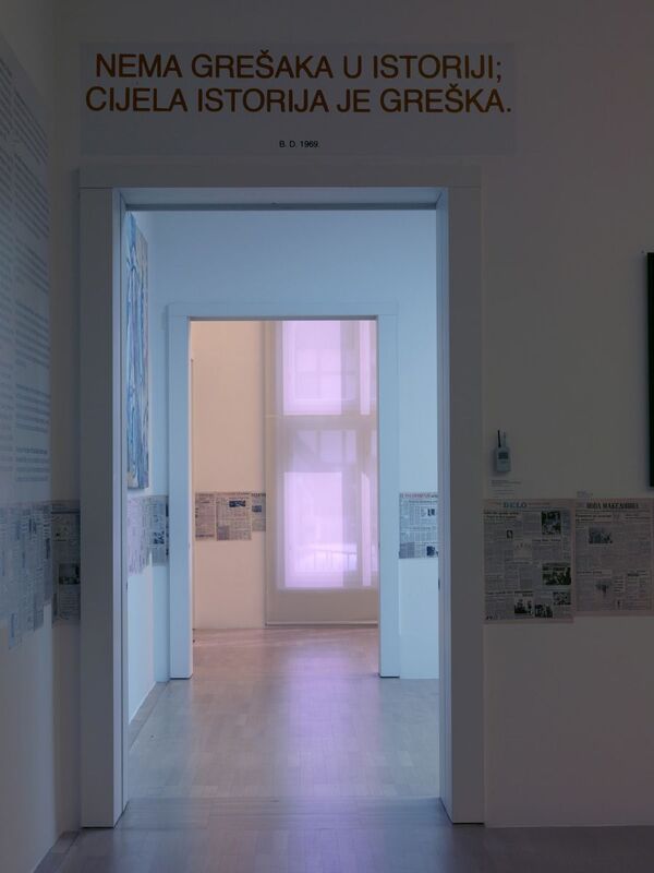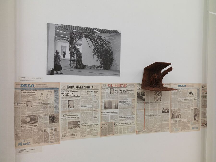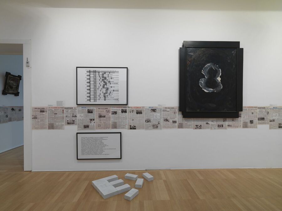 И дело здесь не только в неполноте материалов, но поместить его в конкретный контекст, в первую очередь, исторический. Выставка 1989 года, как говорит Пишкур, была «категорически аполитичной, и организаторы старались избегать любых политических дебатов». Кураторы возвращают политику политику и историю в пространство «Наследия 1989» достаточно прямолинейным способом. Частью экспозиции (буквально фоном для художественных работ) становятся первые полосы главных ежедневных газет югославских республик, выставленные в хронологическом порядке в линию. «Лента новостей» проходит через все залы и заканчивается комментариями Томаша Мастнака, словенского социолога и общественного деятеля.