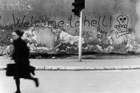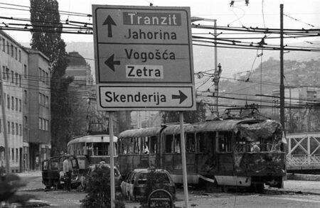 Сараево во время осады города, 1992. // Обломки трамвая на улице после обстрела в районе Скендерия в Сараево, март 1992 года. Фото: Danilo Krstanovic. Courtesy REUTERS.