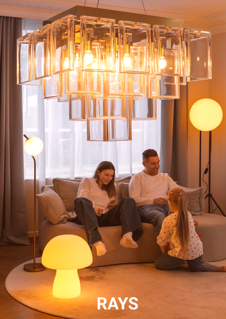 A photo of a modern room with a cozy atmosphere. A young family is relaxing in the room. There is a glass chandelier with rectangular blocks that illuminate the entire room. The chandelier has a rich color and a glossy, reflective surface. There is a floor lamp with a round bulb near the sofa and a lamp in the shape of a minimalist mushroom near the children. The light sources emit a warm and soft yellow-orange light. There is free space on the poster for a company logo.