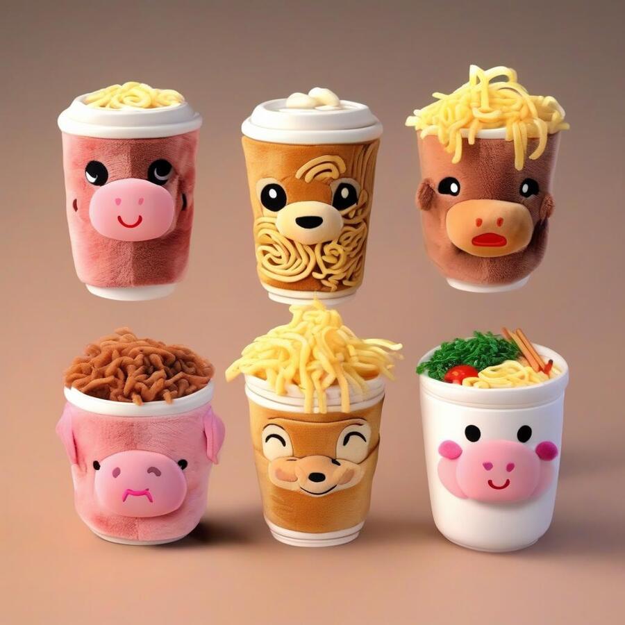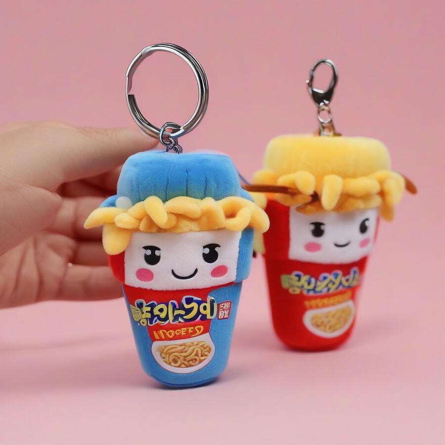 Дополнительными сувенирами стали плюшевые игрушки в виде каробочек с лапшой и разнообразные брелоки. Промт для генерации: plush toy a cardboard box with beef noodles 3d \ plush toy cup noodles 3d keychain character