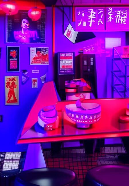 Для создания интерьера кафе использовалась нейросеть Stable Diffusion XL. Без дополнительной обработки в последствии. Был написан следующий использовался следующий промт: Asian street food cafe interior dark purple colors with red neon accents with black and white square printed floor and Asian food posters on the walls and red paper lighters \ with long black tables and tiny red round chairs \ metallic kitchen