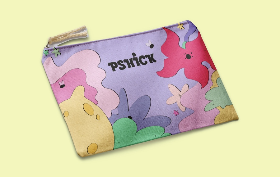 gift bags for dry shampoos «Pshick». On the front of the package in the middle is the black name «Pshick» (instead of a dot above the letter «i» there is a stylized flower) under the name is an inscri