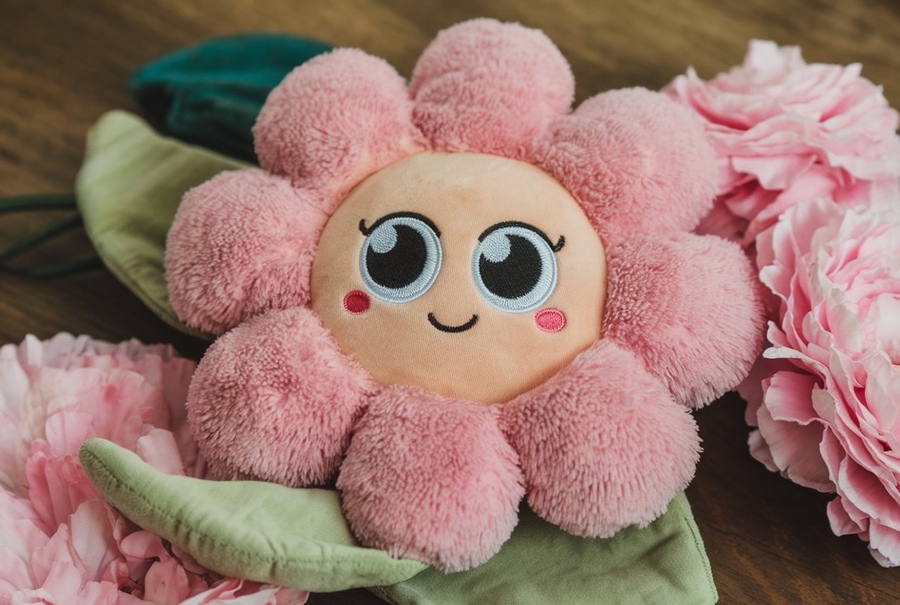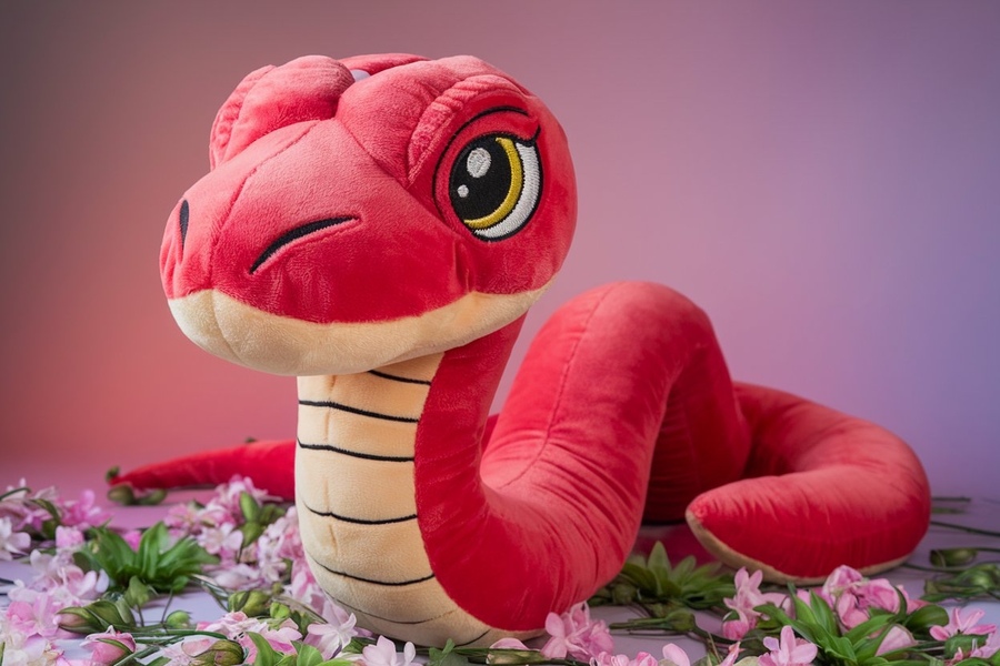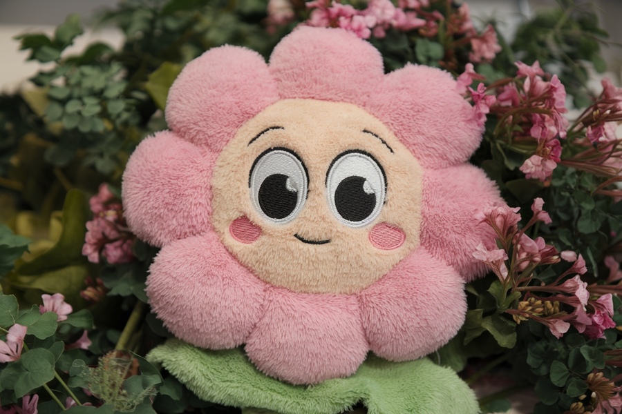 A plush toy of a cartoon flower with a big head and eyes // A plush toy of a cartoon snake with big head. The toy is lying on the grass with flowers