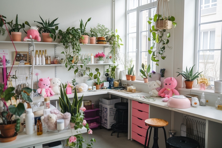 a real small workshop-laboratory for the creation of dry shampoos «Pshick». There are a lot of toys, jars, vegetation and flowers in the workshop.