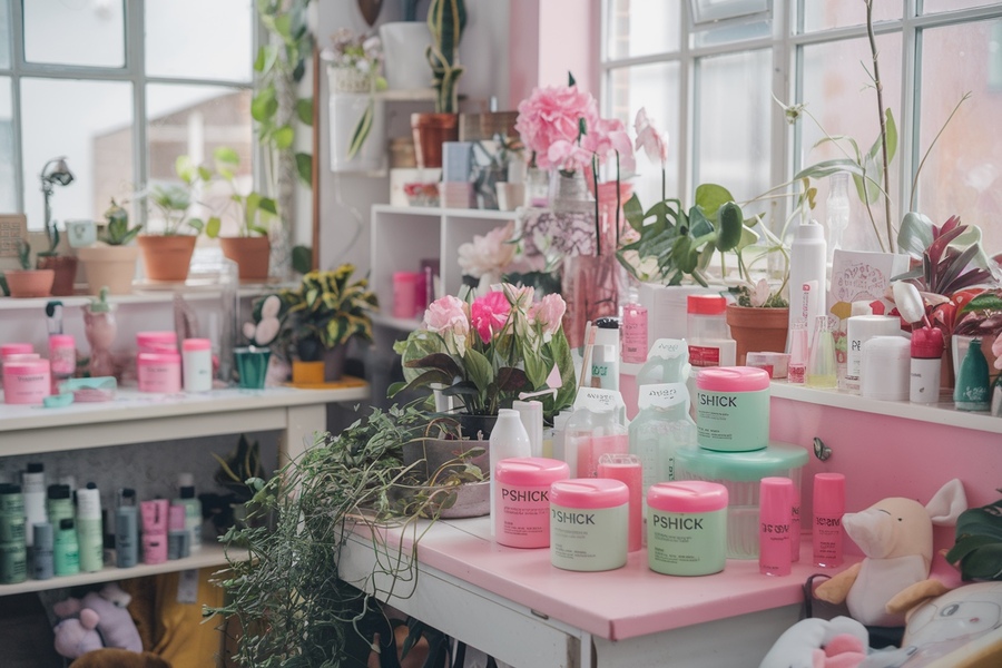 A real little dry shampoo store «Pshick». There are a lot of shampoos, jars, vegetation, soft toys and flowers in the store. Shop in pink and green shades