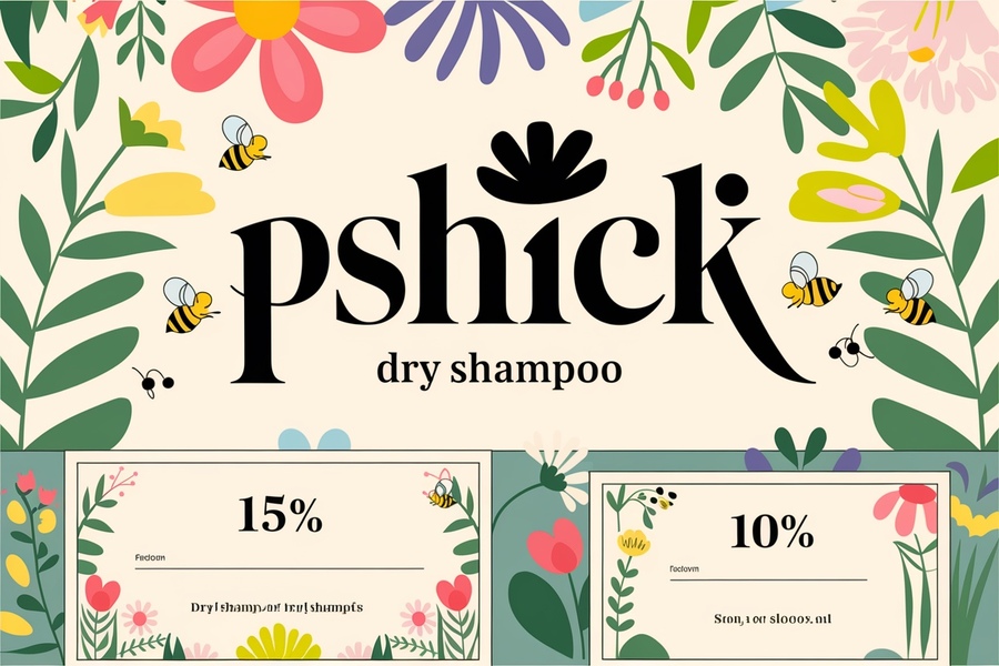 Discount certificates for the purchase of dry shampoos «Pshick» by 5% and 10%. The certificates are illustrated in detail with cartoon-style flowers, plants, and bees. The name «Pshick» is black and