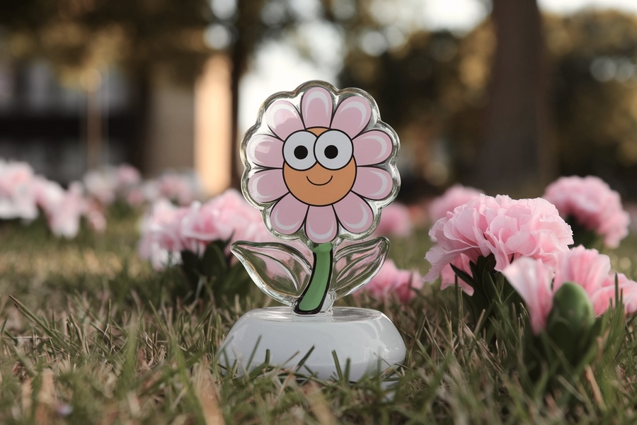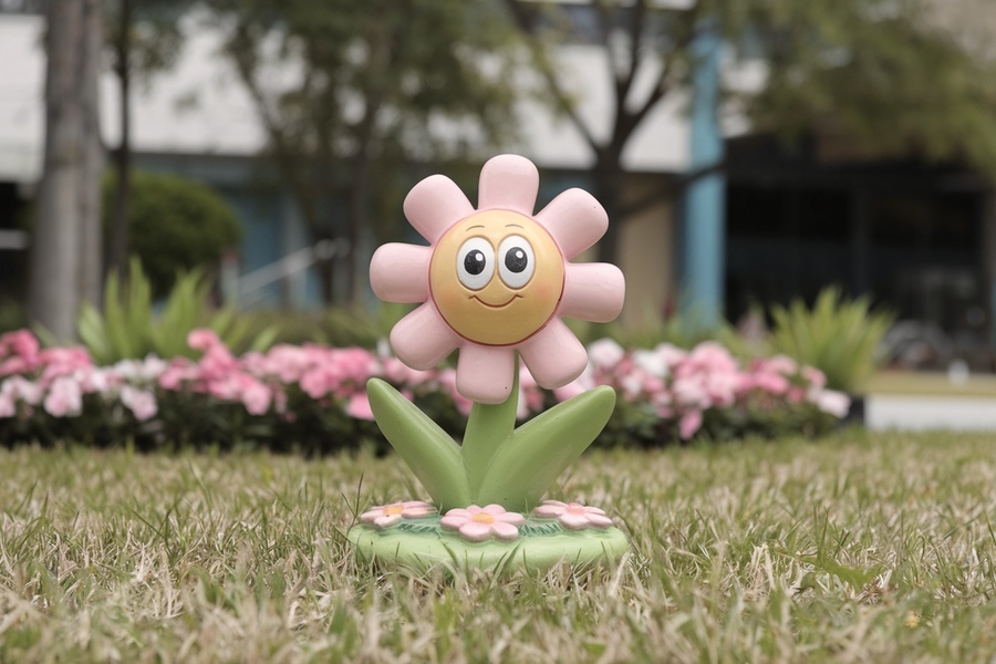 A real decorative branded cartoon flower figurine with eyes. The figure stands on the grass in flowers