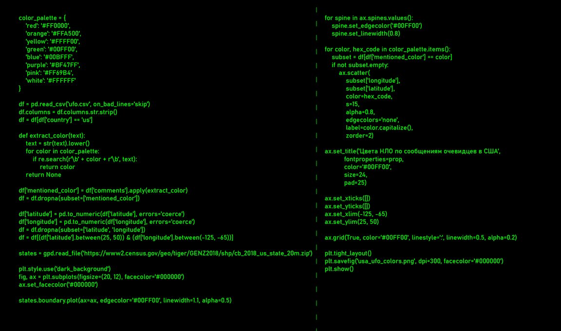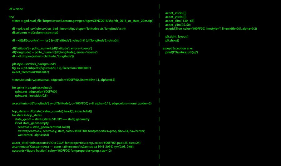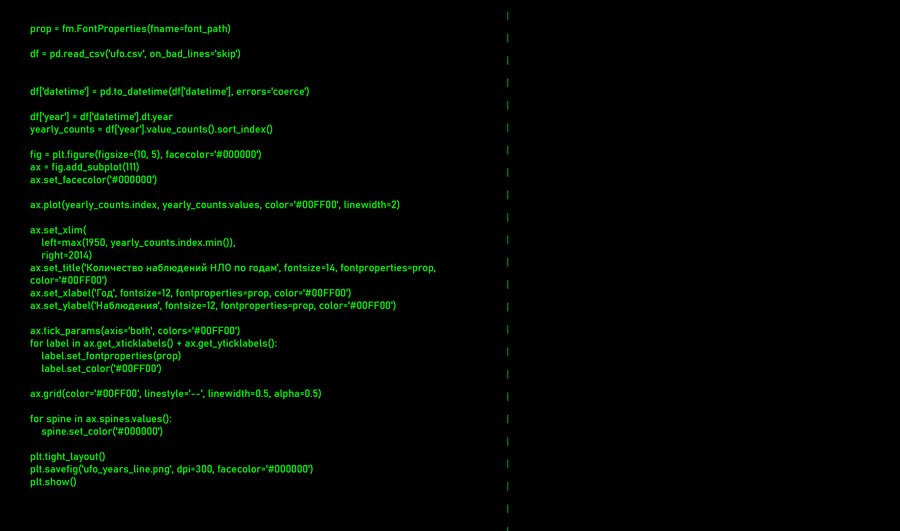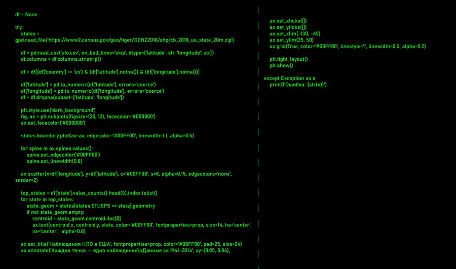 В качестве материала для анализа я выбрала данные о наблюдениях НЛО из датасета UFO Sightings с платформы Kaggle. Он содержит более 80 000 отчетов за последний век, включая данные о дате и времени, городе, штате, стране, форме объекта, длительности наблюдения, комментариях очевидцев, дате публикации и географических координатах.