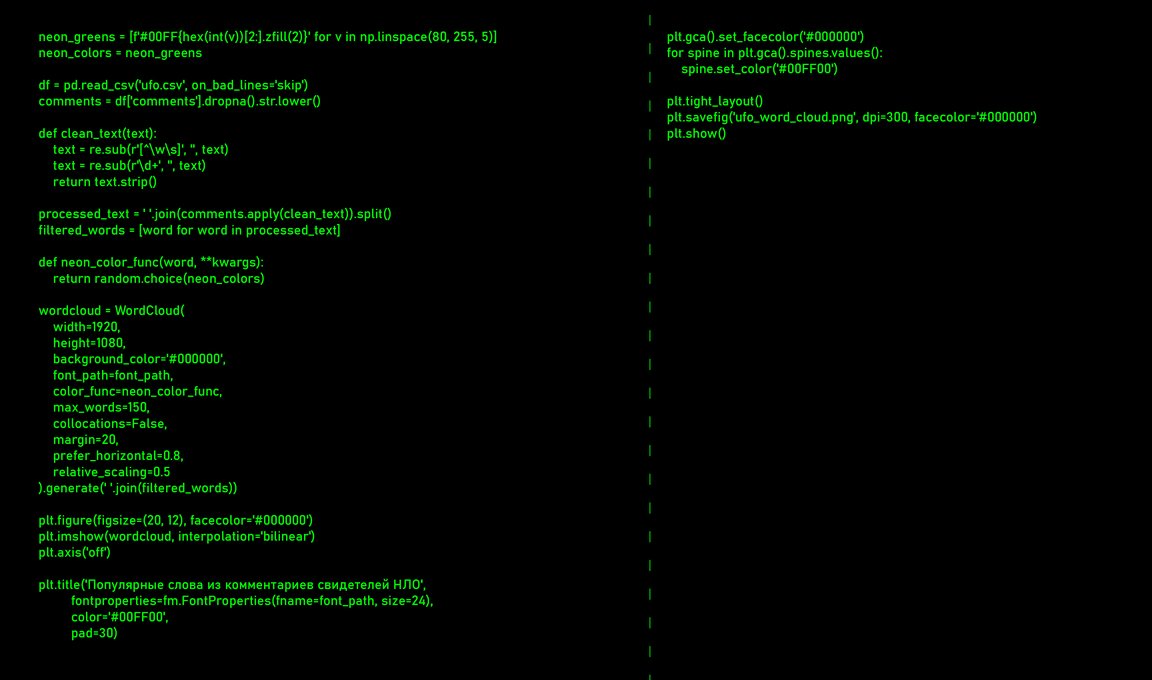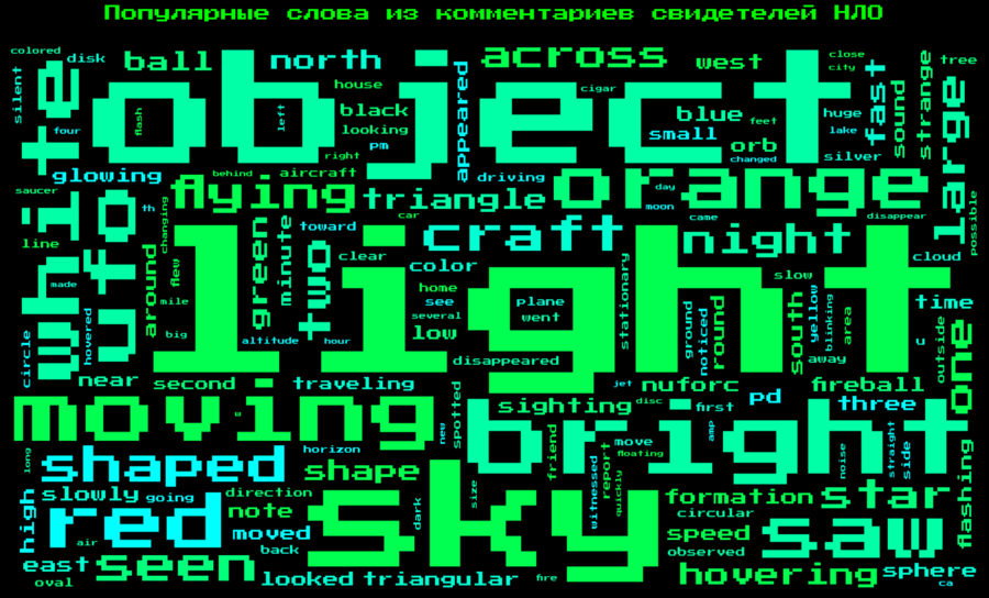 Облако слов визуализирует наиболее частые термины в описаниях очевидцев НЛО. Размер слова отражает частоту его употребления
