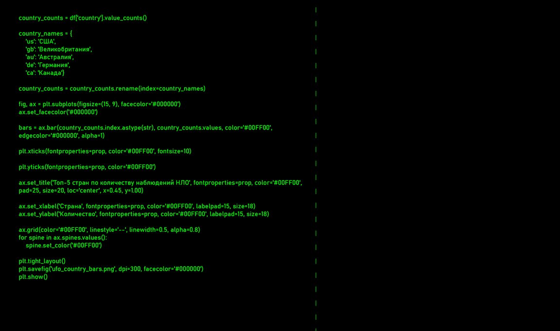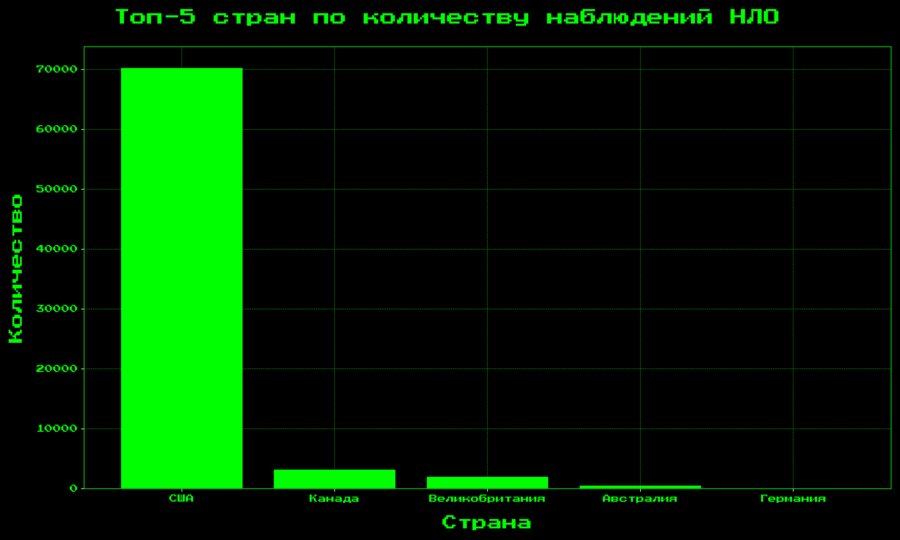 Столбчатая диаграмма отображает топ-5 стран по количеству зарегистрированных наблюдений НЛО. Высота столбцов пропорциональна числу случаев