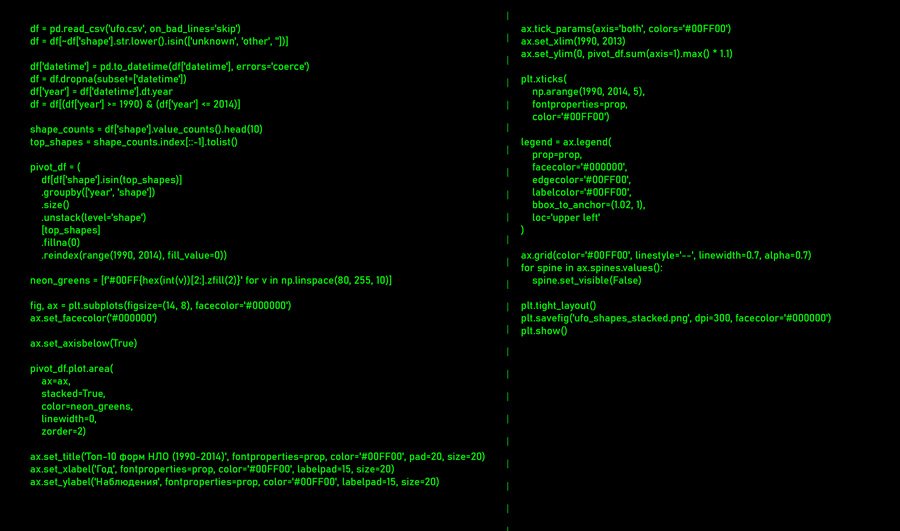 Наверняка тема НЛО привлекала многих еще с детства своей загадочностью и таинственностью — в поп-культуре она всегда была окружена яркими образами и легендами. Об НЛО сняты десятки фильмов, сериалов и создано множество игр, а в детстве истории о них воспринимались как захватывающие страшилки — пугающие, но манящие своей загадочностью. Даже если большинство образованных людей относятся к реальным наблюдениям НЛО с изрядной долей скепсиса, мне все равно было интересно взглянуть на эту тему с объективной точки зрения: как жители разных стран, городов и штатов описывали свои встречи с необъяснимым, как менялось восприятие этого феномена с течением времени и какие закономерности можно обнаружить в этих данных