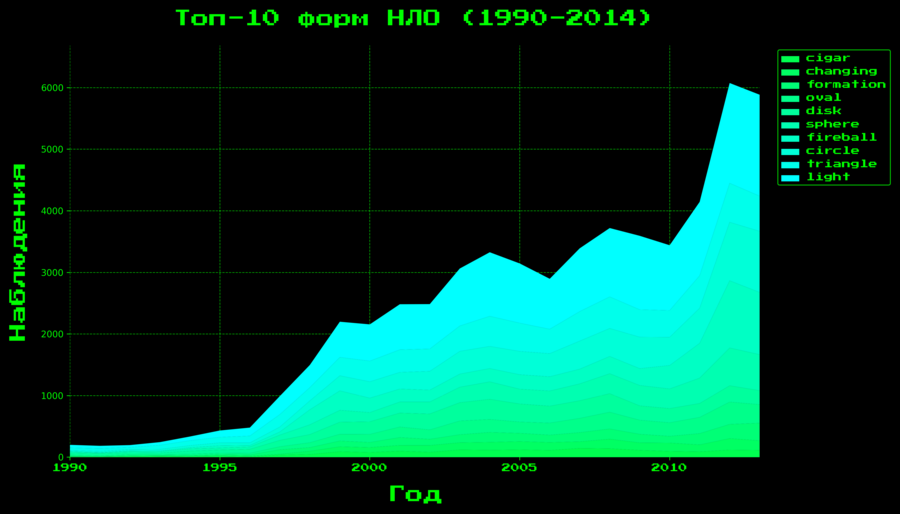 Диаграмма с областями показывает изменение частоты встречаемости 10 основных форм НЛО в наиболее активный период