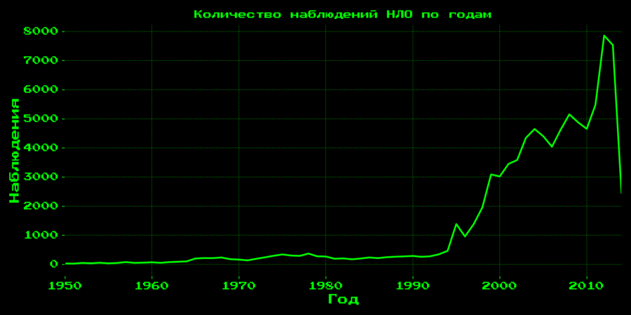 Линейный график показывает динамику сообщений о наблюдениях НЛО с первой половины XX века по 2014 год