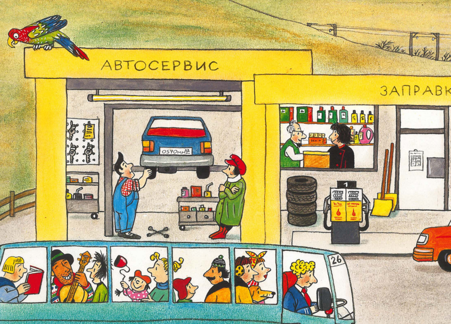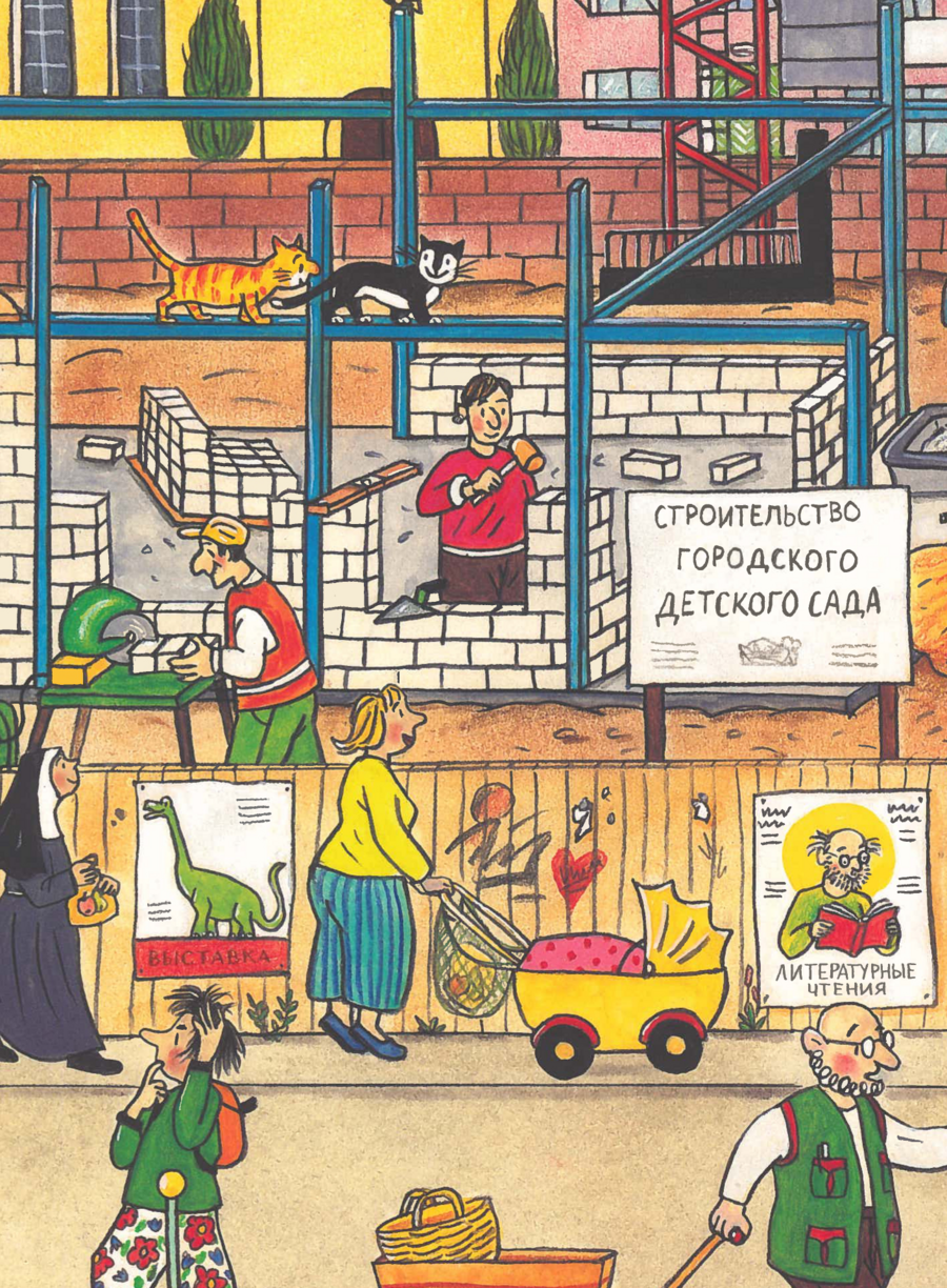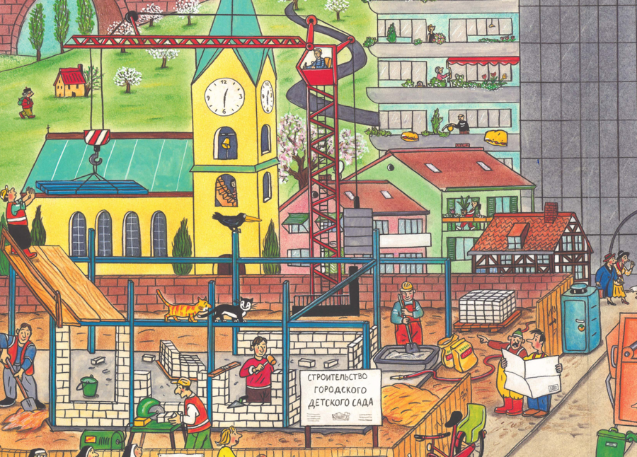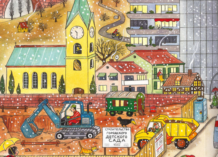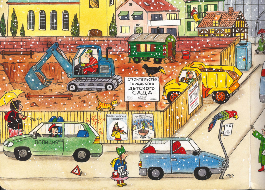 В данных виммельбухах хоть и почти отсутствует текст в сравнении с другими книгами для детей, но слова все же присутствуют. Чаще всего это короткие названия заведений или информация на плакатах, баннерах. Это комфортный объем текста для детей только начинающих читать.
