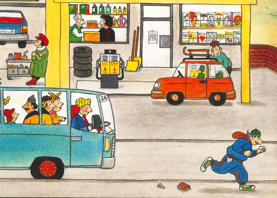 Во всех книгах существует поддерживающая сюжетная линия — история на переднем плане. Перед сменяющимися локациями находится дорога, по которой в каждой из частей едет какой-либо транспорт, а также тротуар, где постепенно развивается сюжет с пешеходами. Эта история будет идти на протяжении всей книги, например, автобус будет ехать на каждой странице, а персонажи куда-то спешить через весь город. Кроме того, в этой части виммельбуха автор закладывает истории с поучительным характером. Так, в зимней книге персонаж Марк на одной из страниц теряет свои ключ и кошелек во время бега, а маленькая девочка Ирина догоняет его и возвращает пропажу. А в осенней истории Полина врезается в столб, так как читает на ходу.