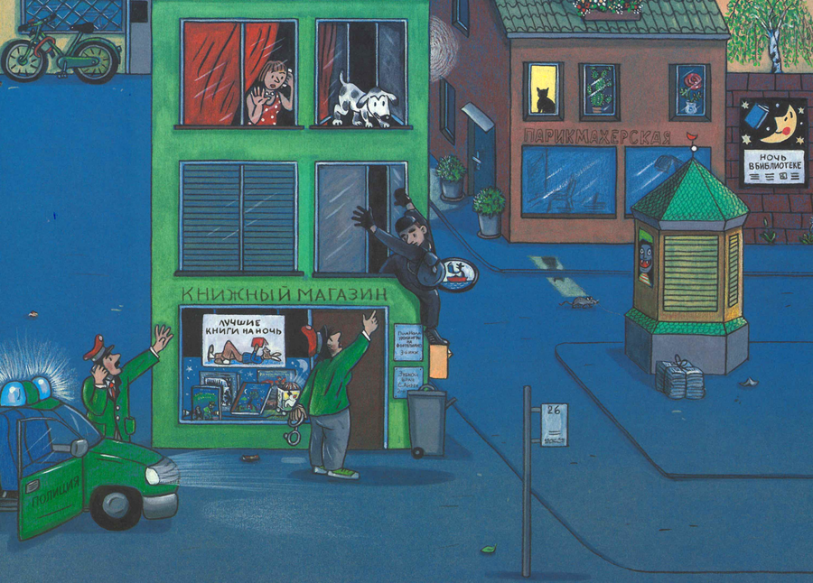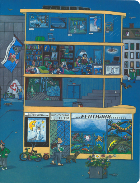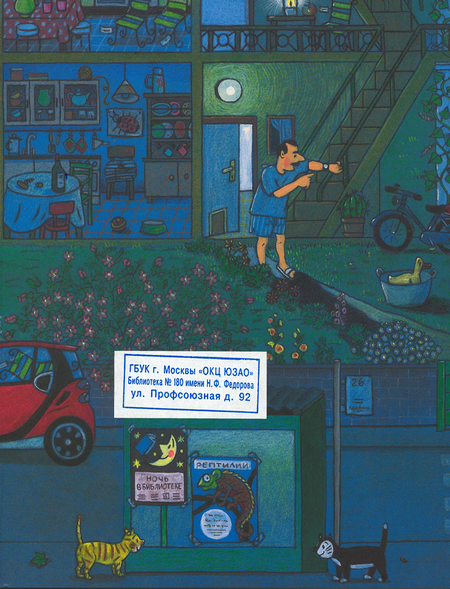 Интересно, что плакаты могут отсылать читателя к другим разворотам книги. Так, например, в «Ночной книге» на остановке у дома весят плакаты о ночи в библиотеке и выставке рептилий, а на другой странице в культурном центре на третьем этаже ребята в библиотеке уже читают друг другу книги, а на первом расположилась та самая выставка рептилий.