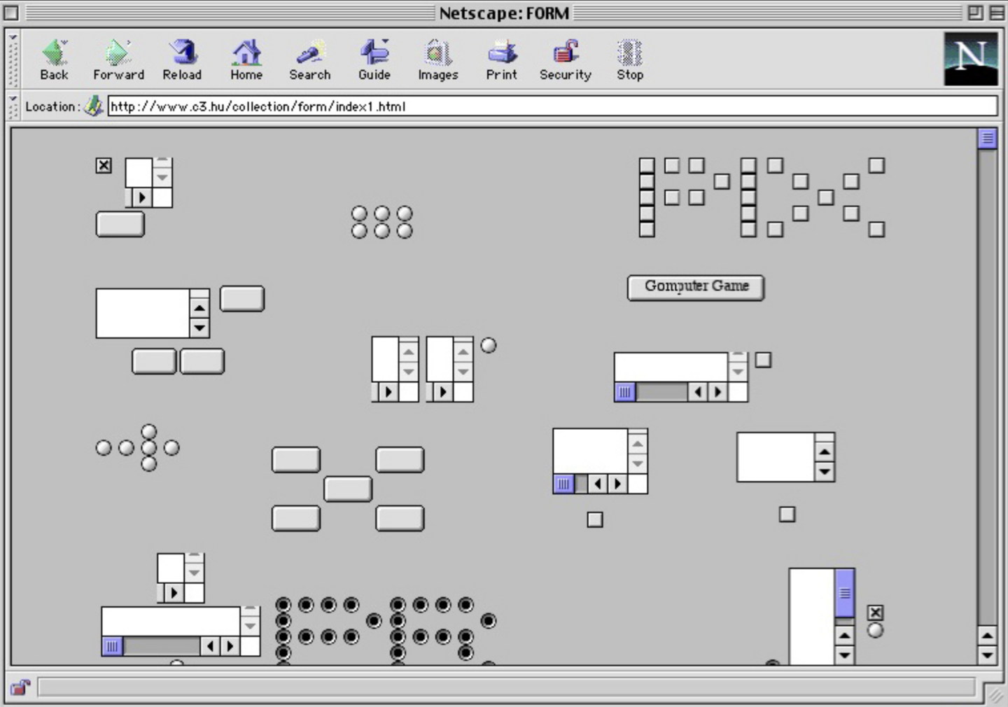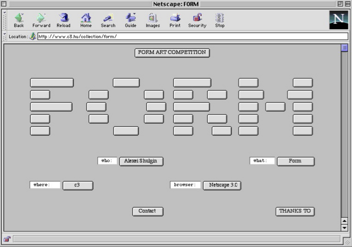 В 1997 году Алексей Шульгин представил работу Form Art, в которой утилитарные элементы веб-интерфейса — кнопки, чекбоксы, поля ввода — были переосмыслены как материал для абстрактных композиций, демонстрируя художественный потенциал языка веб-технологий. Этот проект стал важной вехой в развитии цифрового искусства, поскольку превращал стандартные компоненты интерфейса в объект эстетического высказывания.